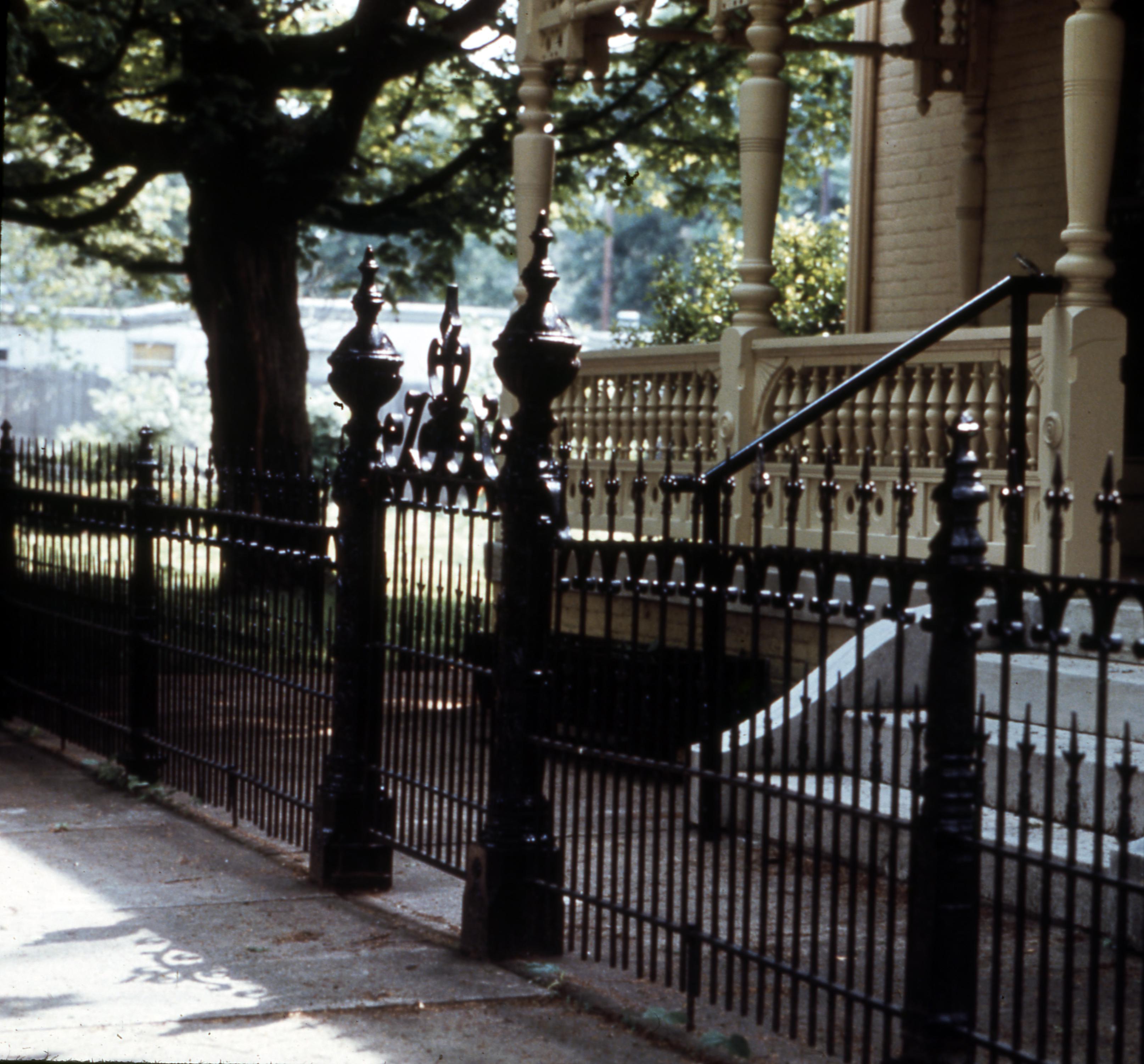Schnee House: This photo is of the second Schnee home located at 603 West Street and was constructed in 1876. The first Schnee home was constructed during the Rappite occupation of the town, the Schnee brothers having moved to the town from the Quaker colony in Pennsylvania, and that house was located at 517 Tavern Street. The Gypsy Girl Livery Stable was later constructed behind that home. This is the cast iron fence and gate leading to the front of the house on the side facing West Street.