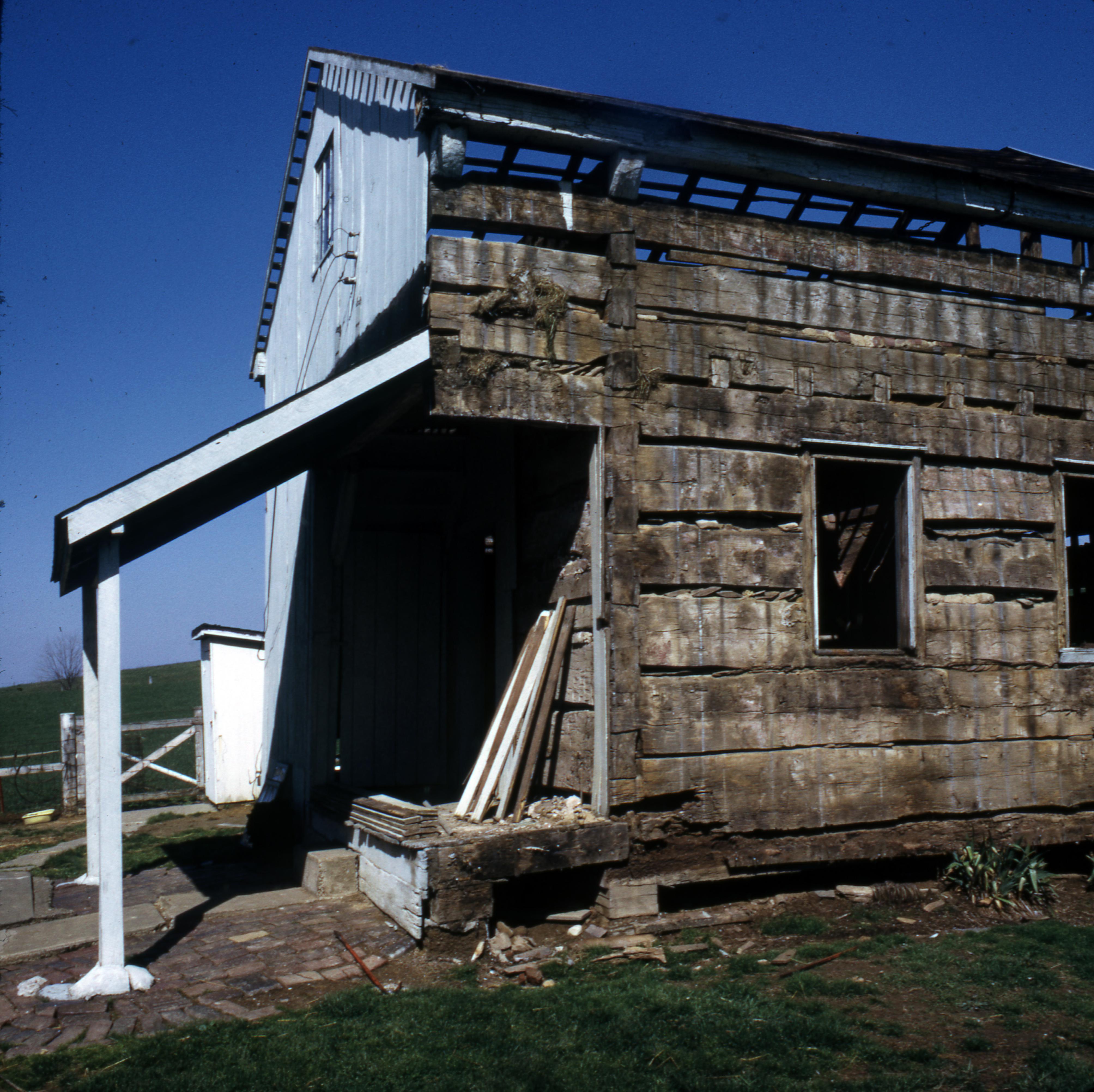 West Street Log Cabins: These buildings are now located along the southwest corner of North and West Streets. They were created from the John Spencer log house in Crossville, Illinois which was dismantled and transferred to New Harmony, Indiana. The logs from the house were used to reconstruct the West Street Log Cabins. This photo shows an outbuilding which was located close to the house, the logs of which were also used in the construction of the cabins.