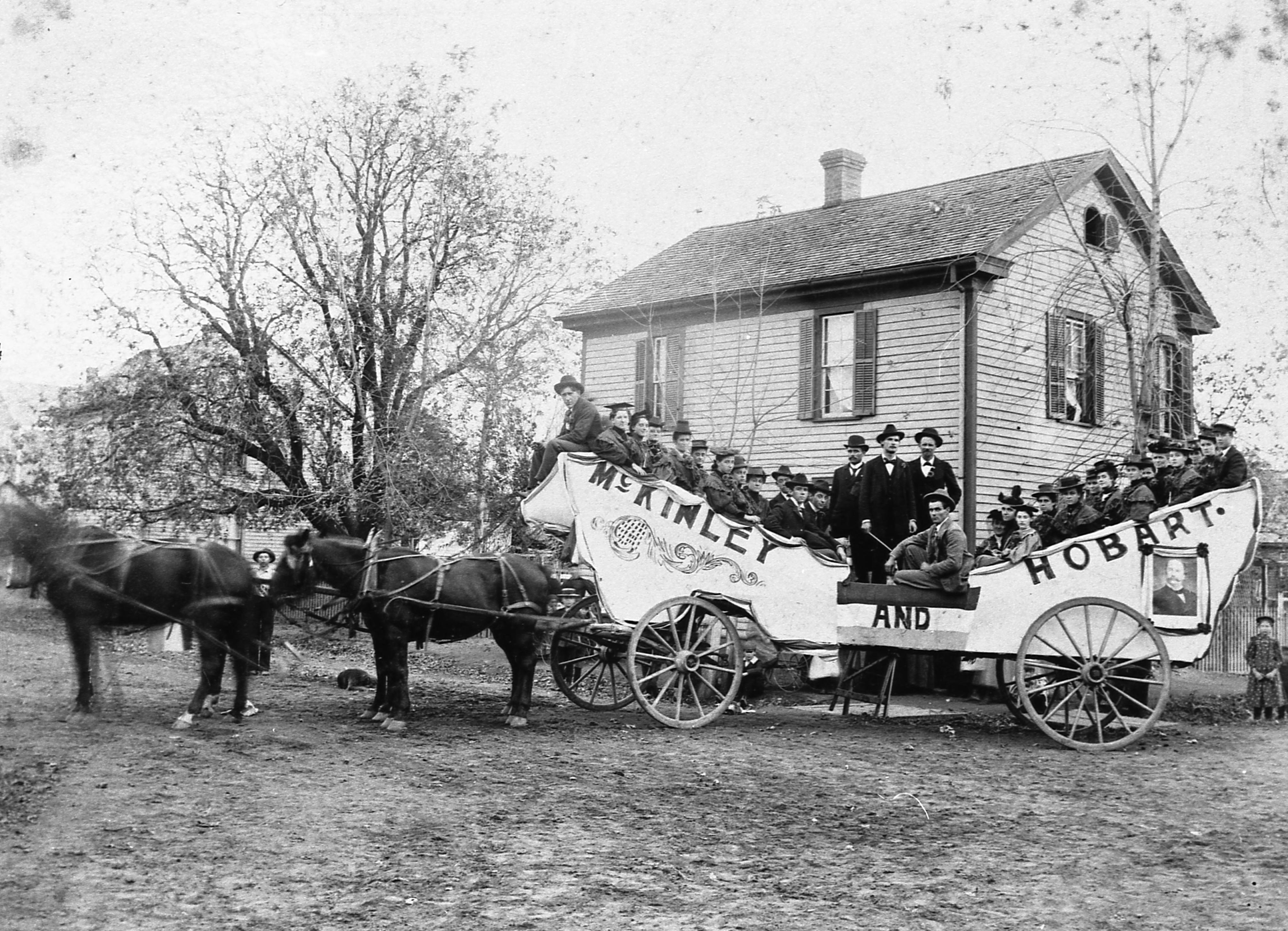 Transparencies and Negatives Collection: Historic photographs. McKinley and Hobart 1896 Presidential Campaign. William McKinley was a U.S. congressman from 1876 until 1890 and was Governor of Ohio from January 1892 to January 1896 at which time he ran for President of the United States, which he won. He was the 25th President from 1897 until he was assassinated, being shot by Leon Czolgosz on September 6, 1901, which he succumbed to on September 14, 1901. His Vice President was Garret Augustus Hobart, who served from 1897 until his death, from heart disease, on November 21, 1899. This photo was taken in front of the Autrieth House which is located on the corner of Tavern and Brewery Streets, also known as Wiley�s Corner. The band wagon was built by the New Harmony Band in 1871.
