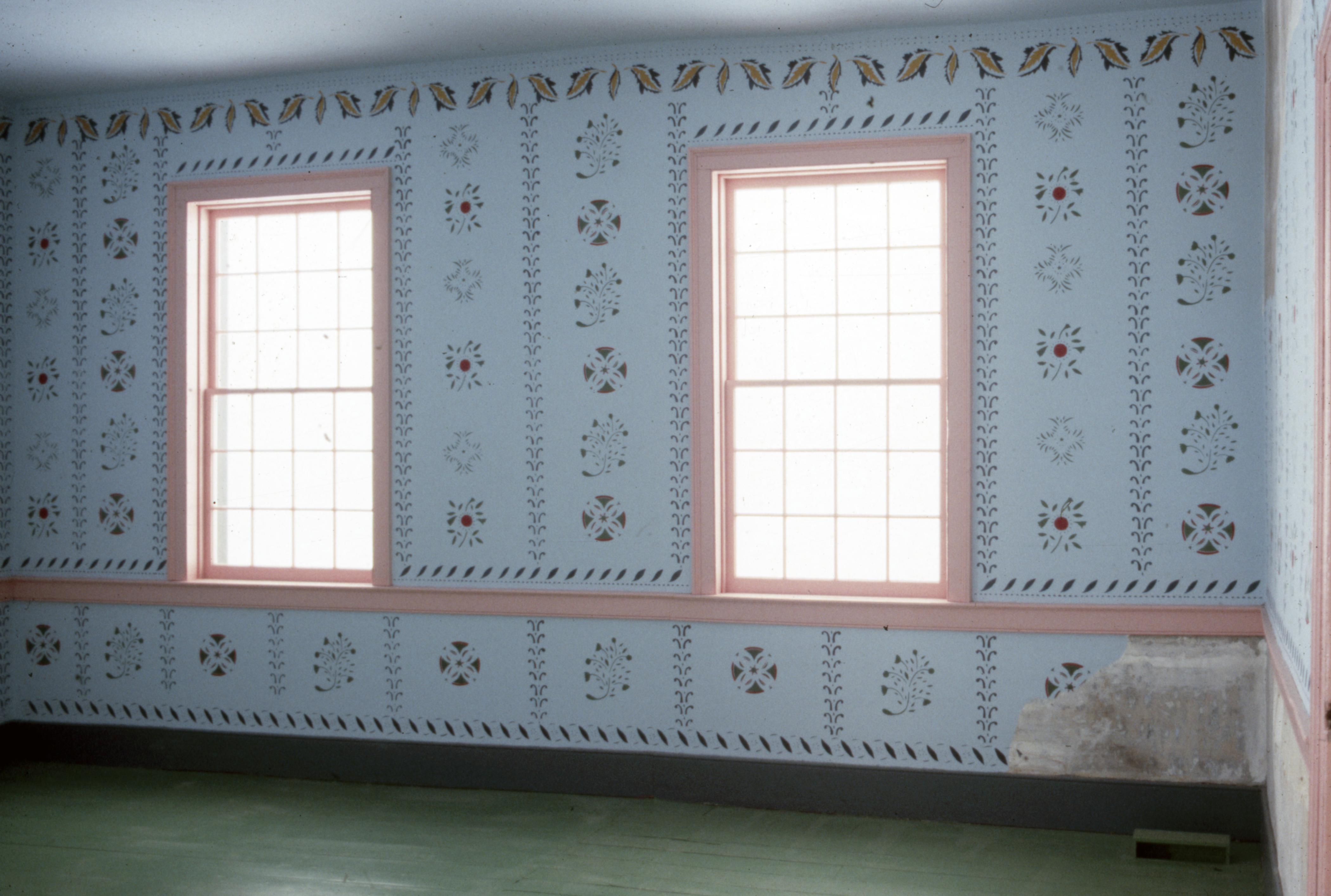 The Jaquess House: This is a photo of the Jaquess House, from which the parlor was taken, was moved from somewhere near Poseyville. It was then taken through a field to near the edge of a highway where it was dismantled. The parlor was then incorporated into the Owen House on the corner of Tavern and Brewery Streets in town block 6 E east. This is the refinished parlor after being incorporated into the 1830 Owen House. The designs on the walls are painted on with stencils cut in period patterns that match the exposed part on the lower right of the wall where traces of the original can still be seen.