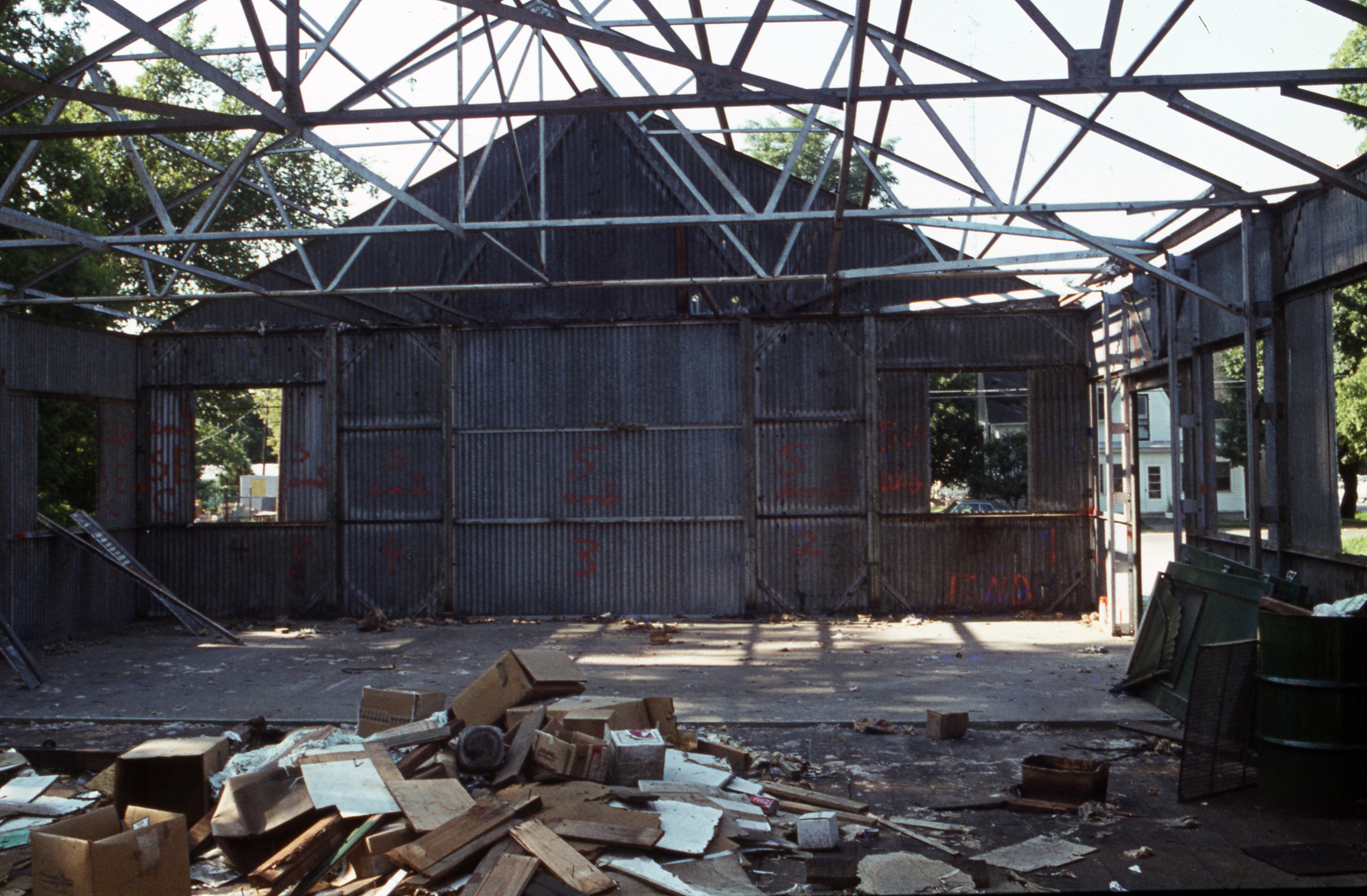 Continental Emsco Company: This building was located on the plat just west of 723 E. Church Street and was dismantled to accommodate the Golden House which was later moved onto this plat. The Continental Emsco Company was incorporated June 4, 1946 in the state of Texas, and dissolution of the company occurred January 31, 1984. The company was in the business of drilling oil wells. In this photo there is a pile of rubbish left in the center of the building from the dismantling of the shelves and stored tools. The rest of the building is marked and ready to be taken apart.