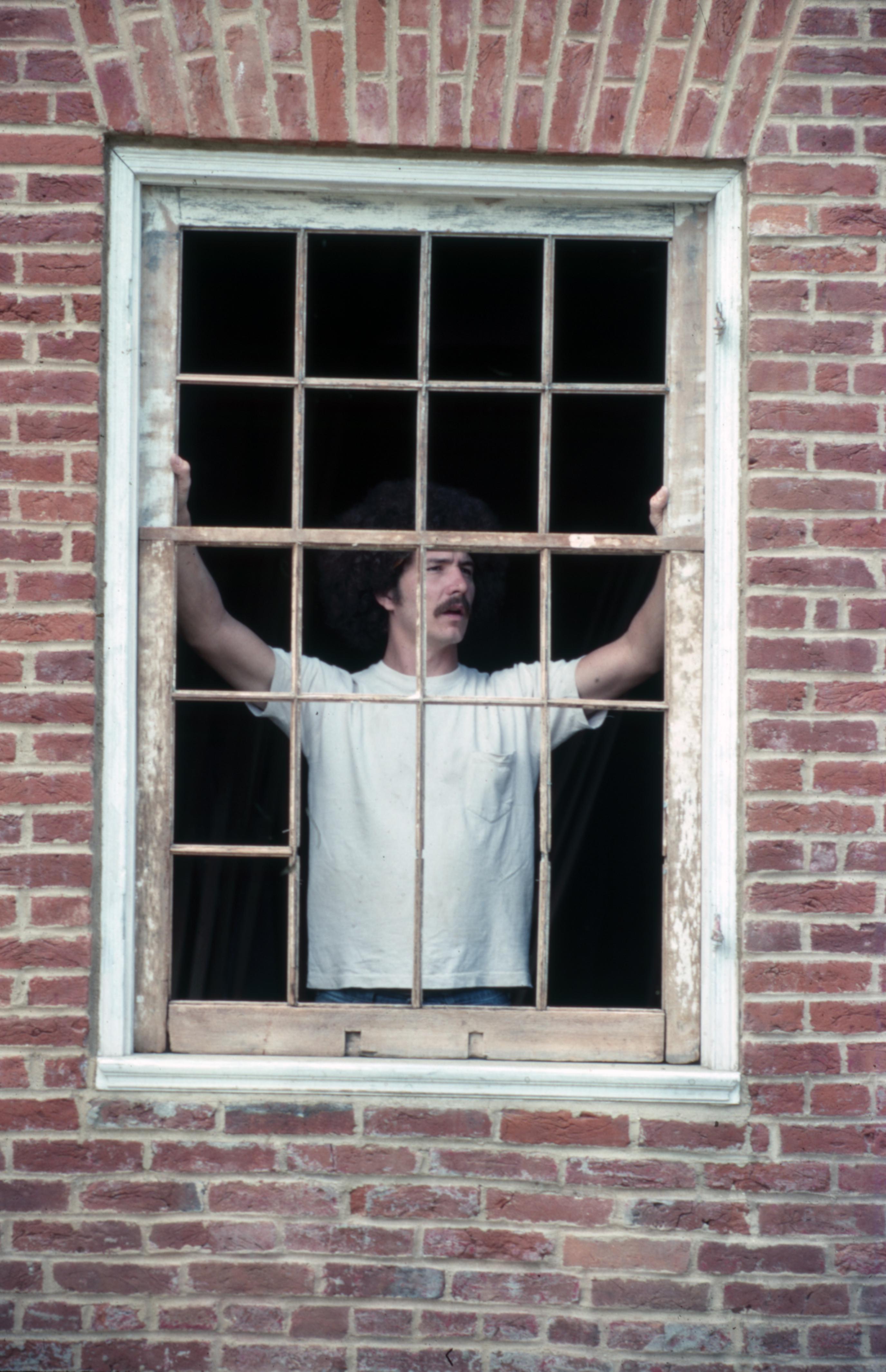 1830 Owen House: A worker is replacing the window sashes on the front side of the 1830 Owen House located at 531 Tavern Street.