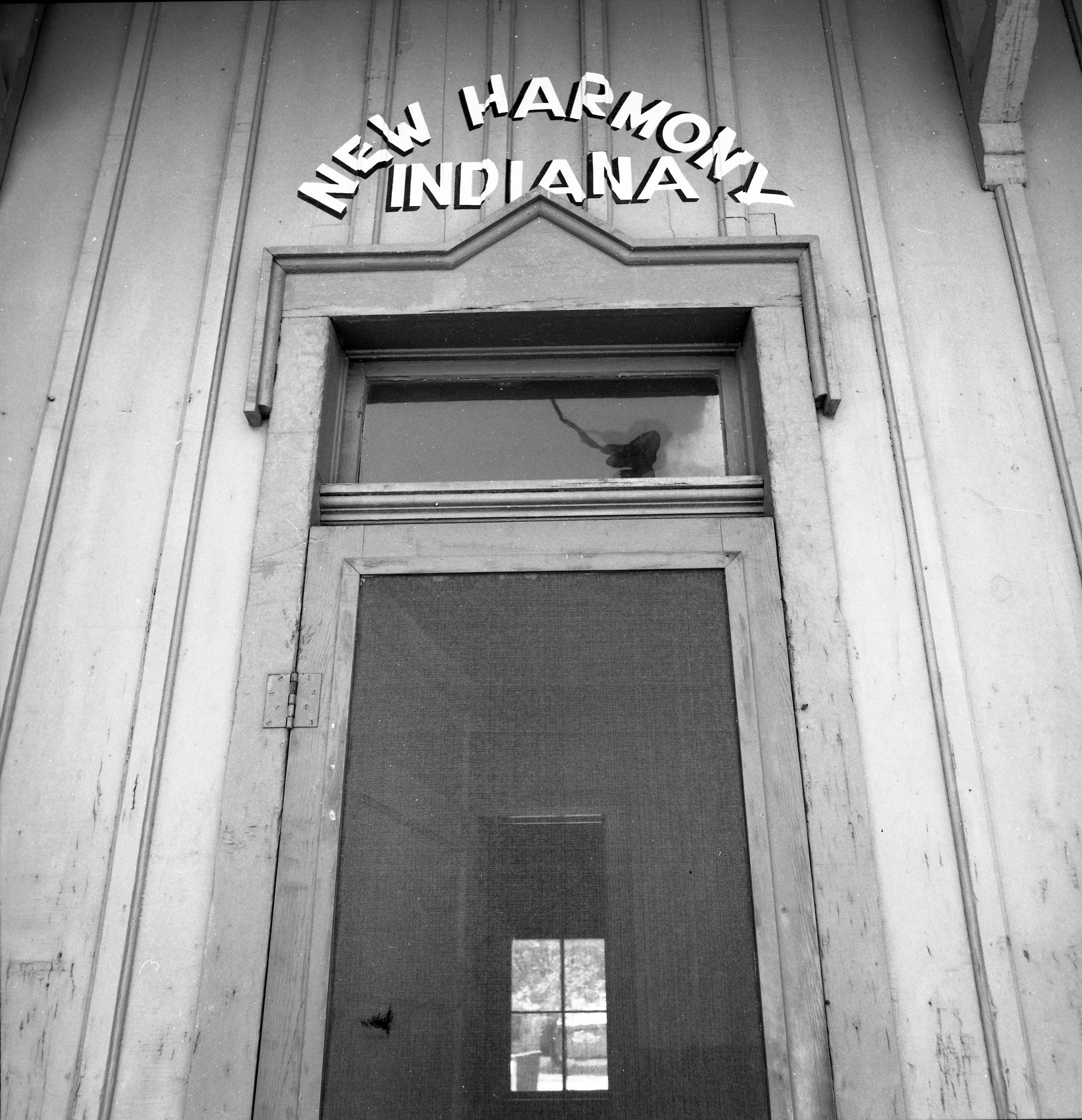 Transparencies and Negatives Collection: Historic photographs. This is a photo of the front door of the Old New Harmony Visitor's Center which used to be located in the old Train Station on the south side of Church Street between Main and Brewery.