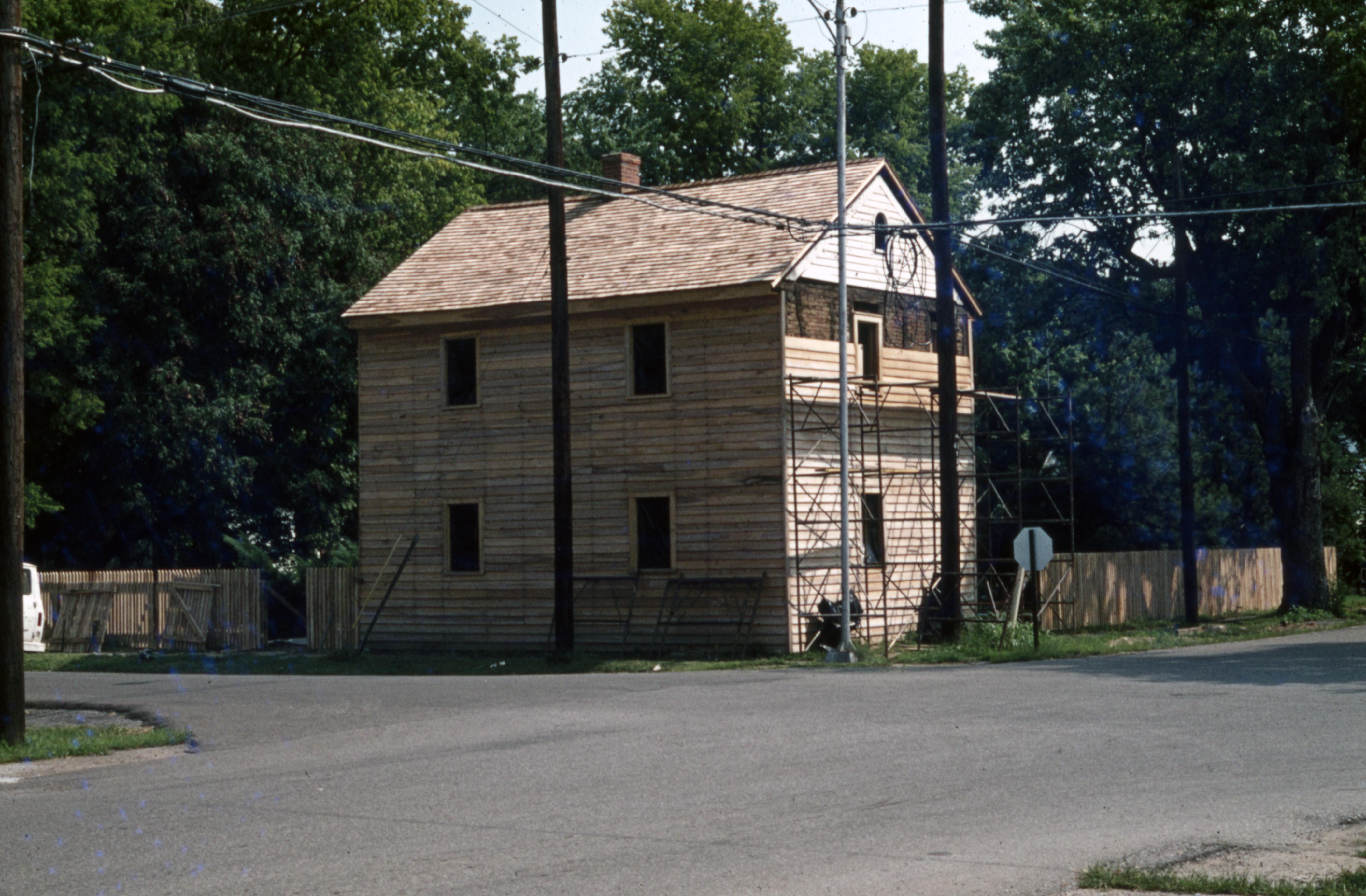 Autrieth House: This house is located at 605 Tavern Street and was constructed in 1855. This photo shows the house with most of the new clapboards in place but before the new windows were installed. The photo was taken from the corner of Brewery and Tavern Streets facing southeast.