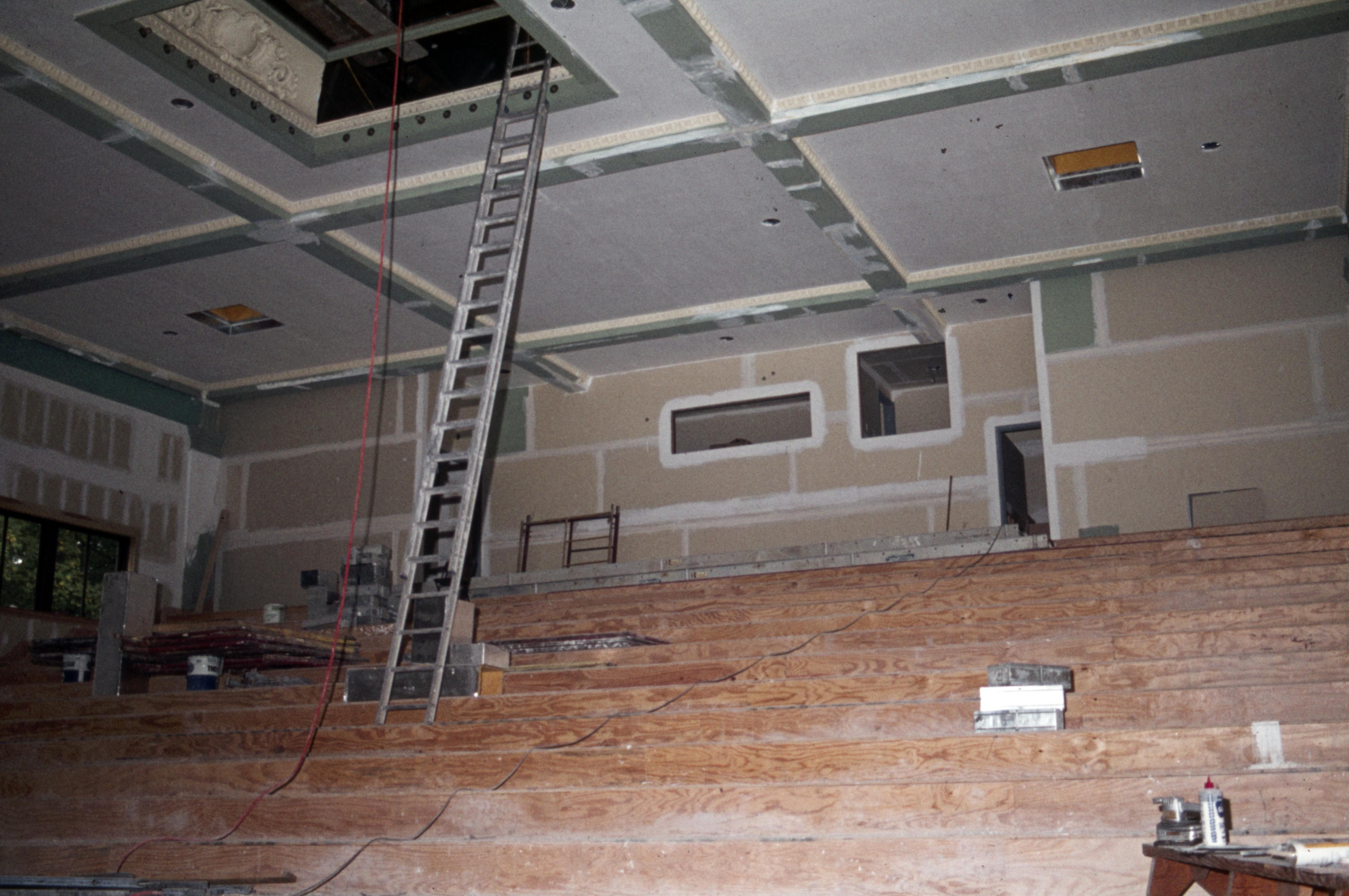 Murphy Auditorium: Murphy Auditorium is located at 419 Tavern Street and was constructed on the plat just east of the Working Men's Institute from 1911 to 1913, using the Doctor Edward Murphy Fund, and was built as part of New Harmony's centennial celebration of 1914. In 2014, the town's bicentennial, Murphy Auditorium became the new home of the concert series Under The Beams, originally housed in the Rapp-Owen Granary. Today, the auditorium is owned by the University of Southern Indiana and is the home of The New Harmony Theater with a seating capacity of 360 people. Refurbish work on the walls of the interior.