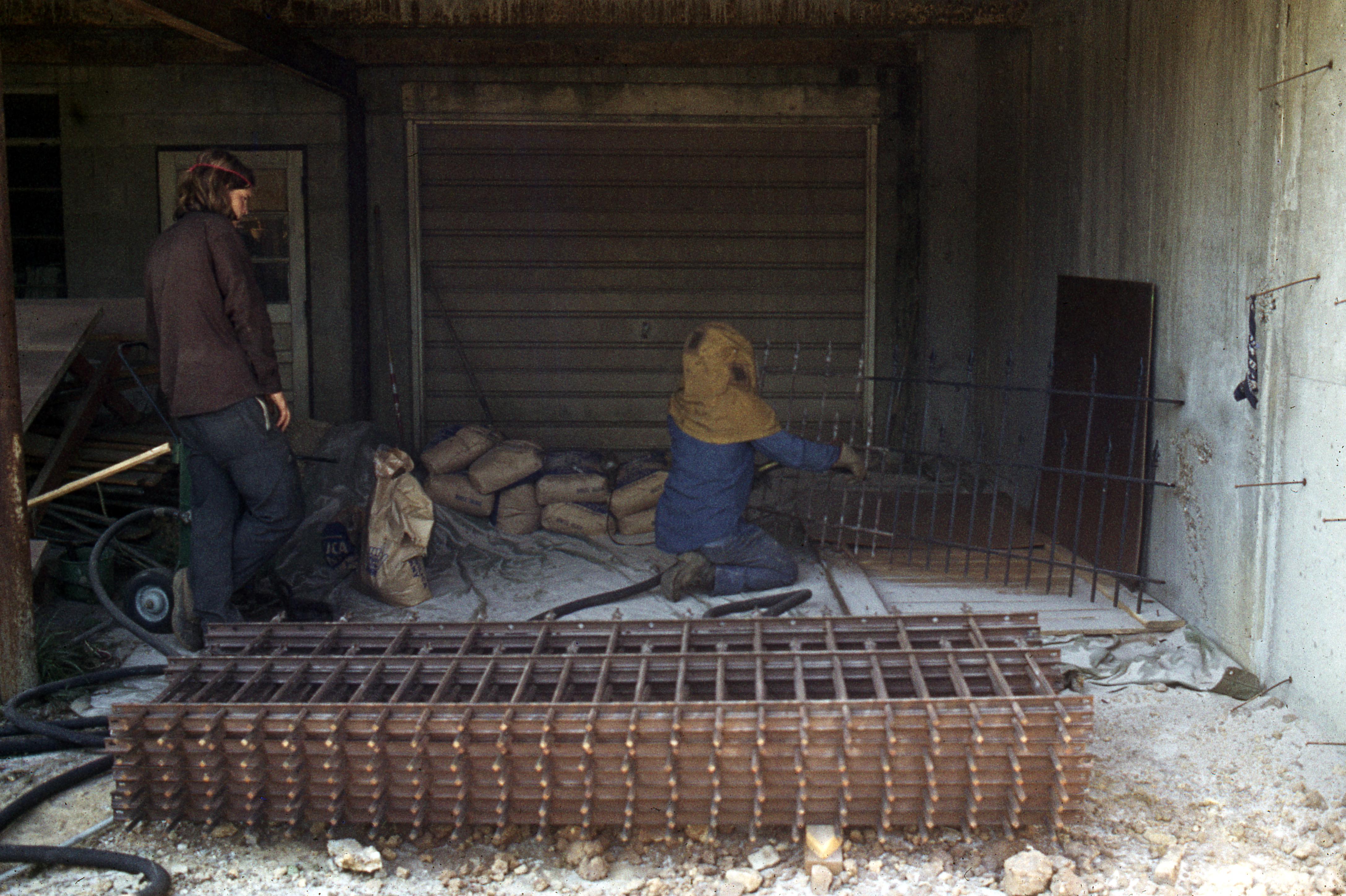 St. Stephen's Episcopal Church: The church was first organized in 1841 and in 1843 the west wing of the old Rappite church was given for use by the Episcopal�s by Alexander and Anne Maclure. At this time the old burial ground was also given to the church, which was bought back by the Rappites in 1846. Then in 1850 the Episcopal�s sold the west wing of the old Rappite Church for $1000 and in 1854 St. Stephen�s Church was constructed, the North Street location where the Lenz House now resides.1888 saw the construction of a new belfry add to the church to accommodate the new bell. In 1911 the new church was built, and an addition was made to it in 1927. The church is still present as of 2022. This photo shows two people repairing the iron fence for the church.