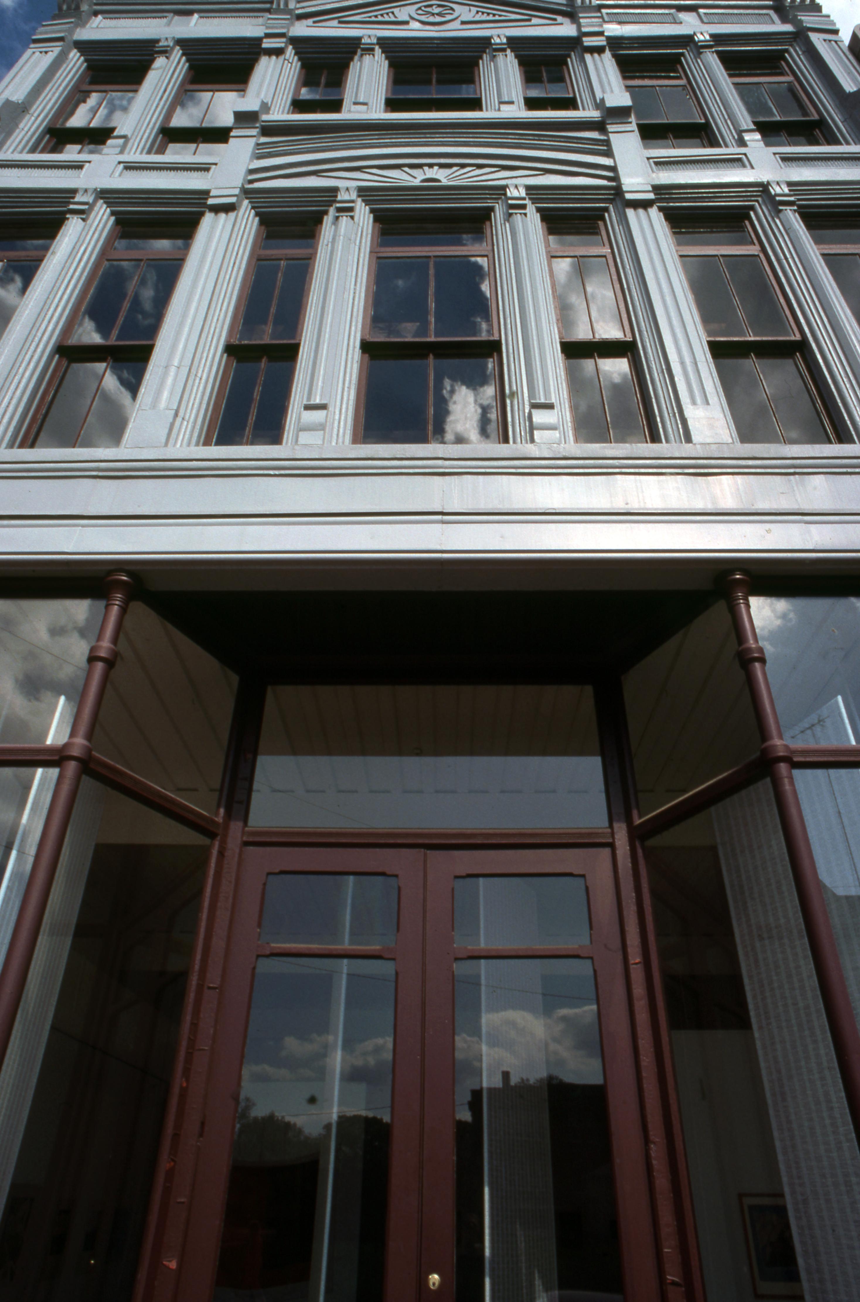 The Owen Building: This building is located at 504 Main Street and was once the right side of 502 Main Street. The two buildings combined have a long history, being built before 1888. They were the location of E. F. Owen and Company�s store, this side being the hardware shop at least until 1907 or later. New Harmony Gallery of Contemporary Art now located in both 504 and 506 Main Street with 506 being used as a sales floor. The art gallery, opened in the fall of 1975, after the building went through refurbishment and is still a part of the University of Southern Indiana today (2021). The gallery is a not-for-profit space for artists to hold exhibitions of their work with a sales floor in the adjoining building at 506 Main. This photo was shot facing straight up from the front of the building, showing the stonework on the second and third stories.