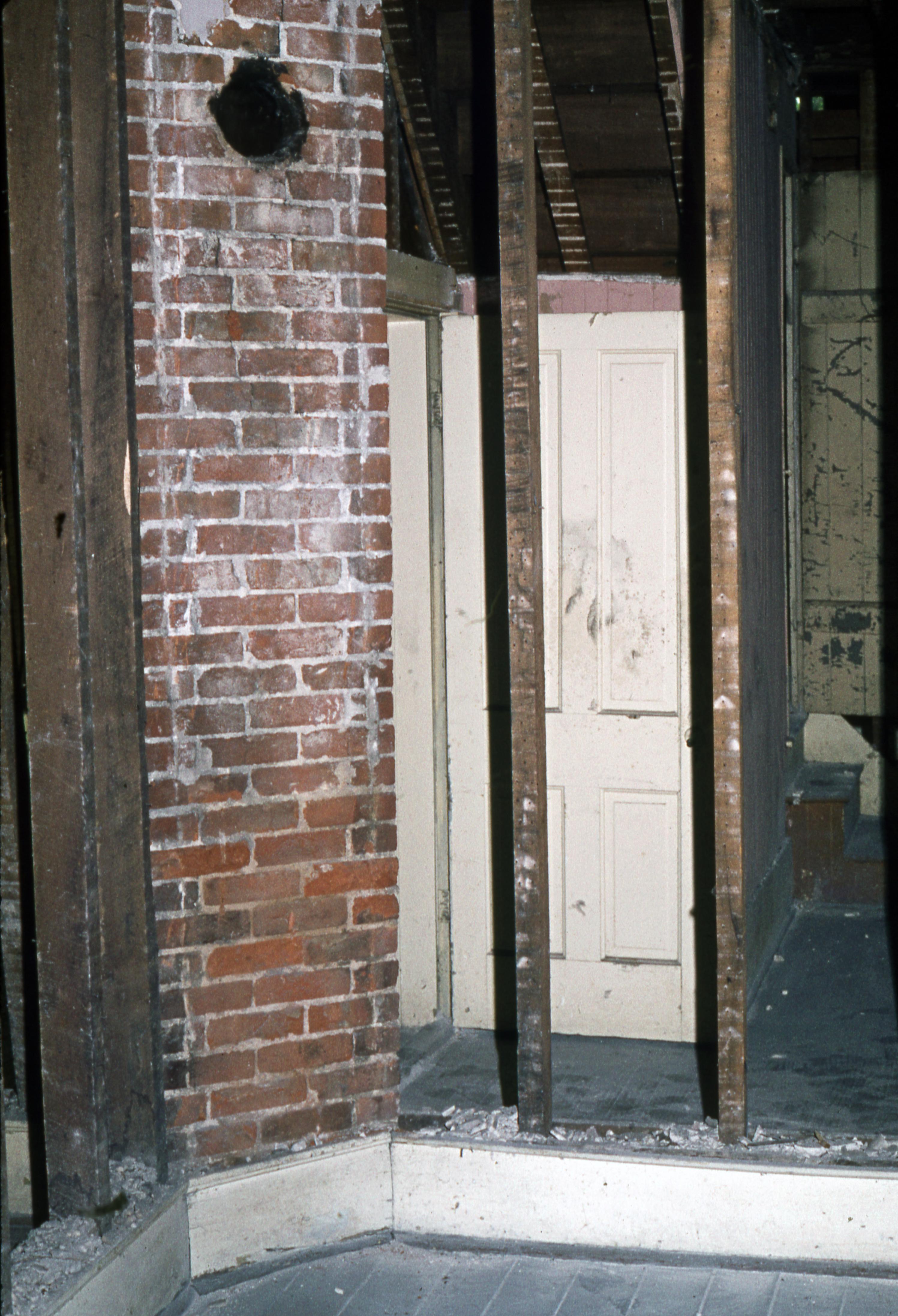 Patterson House: Located at 682 Arthur Street and built in 1850. A corner chimney is visible on the left side of the photo and behind it is the stairwell to the second floor of the house.