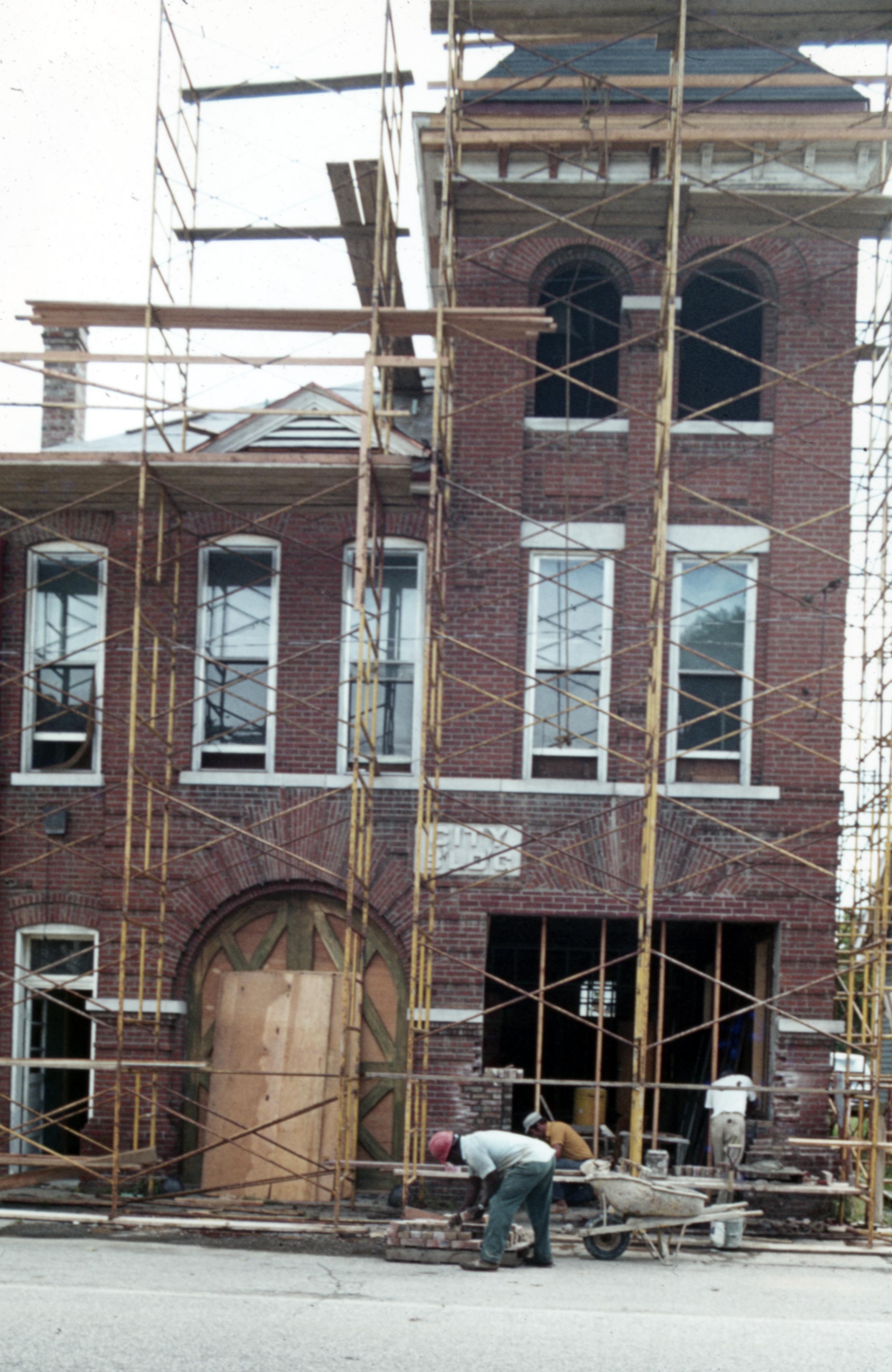 The City Building: This building is Located at 608 Main Street and housed the firehouse on the ground floor and City Hall on the second floor. Workers are blocking up the right side to return the building to the original appearance.