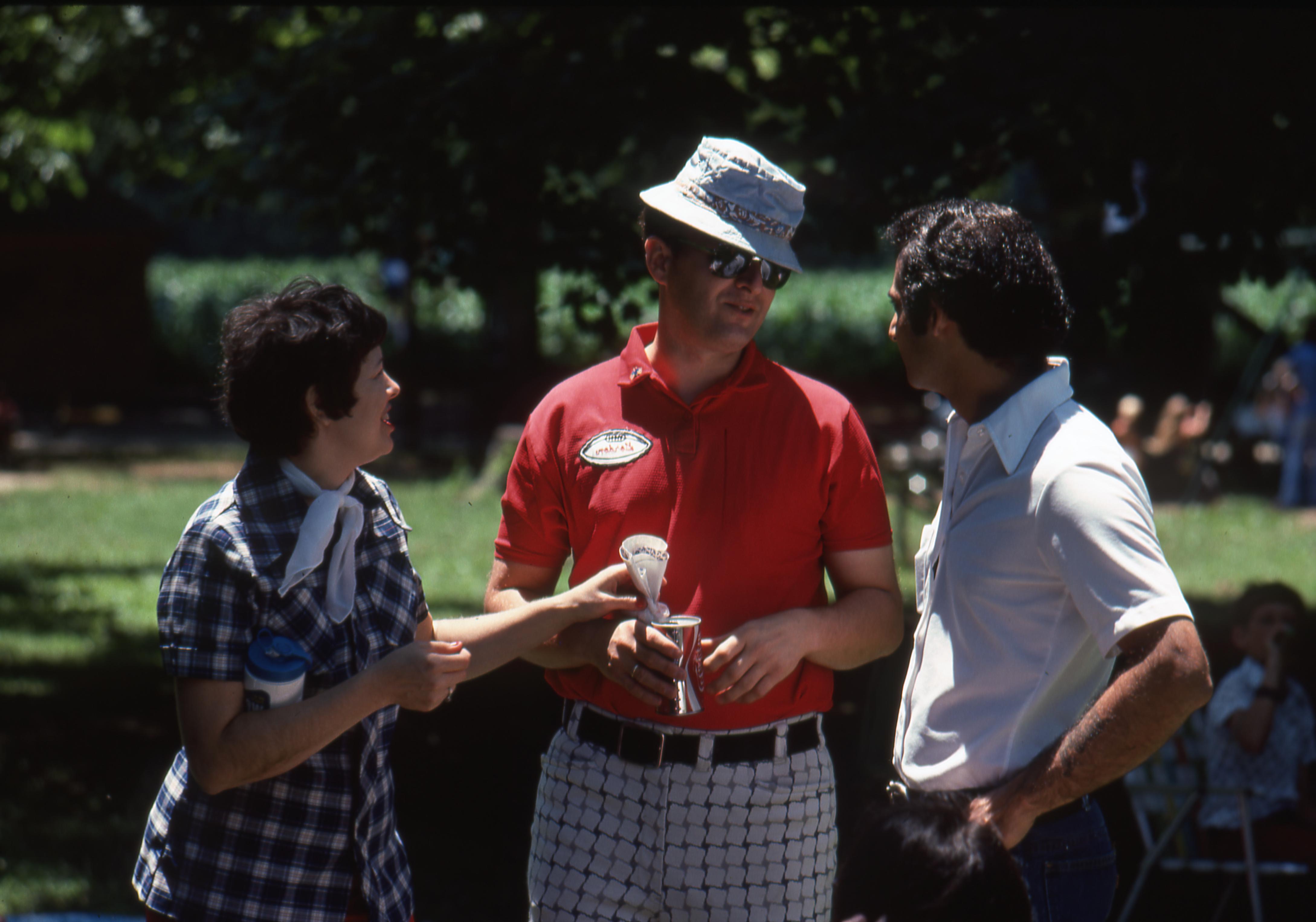 New Harmony Bicentennial Picnic at Murphy Park: This is a photo of two men and a woman chatting at the picnic.