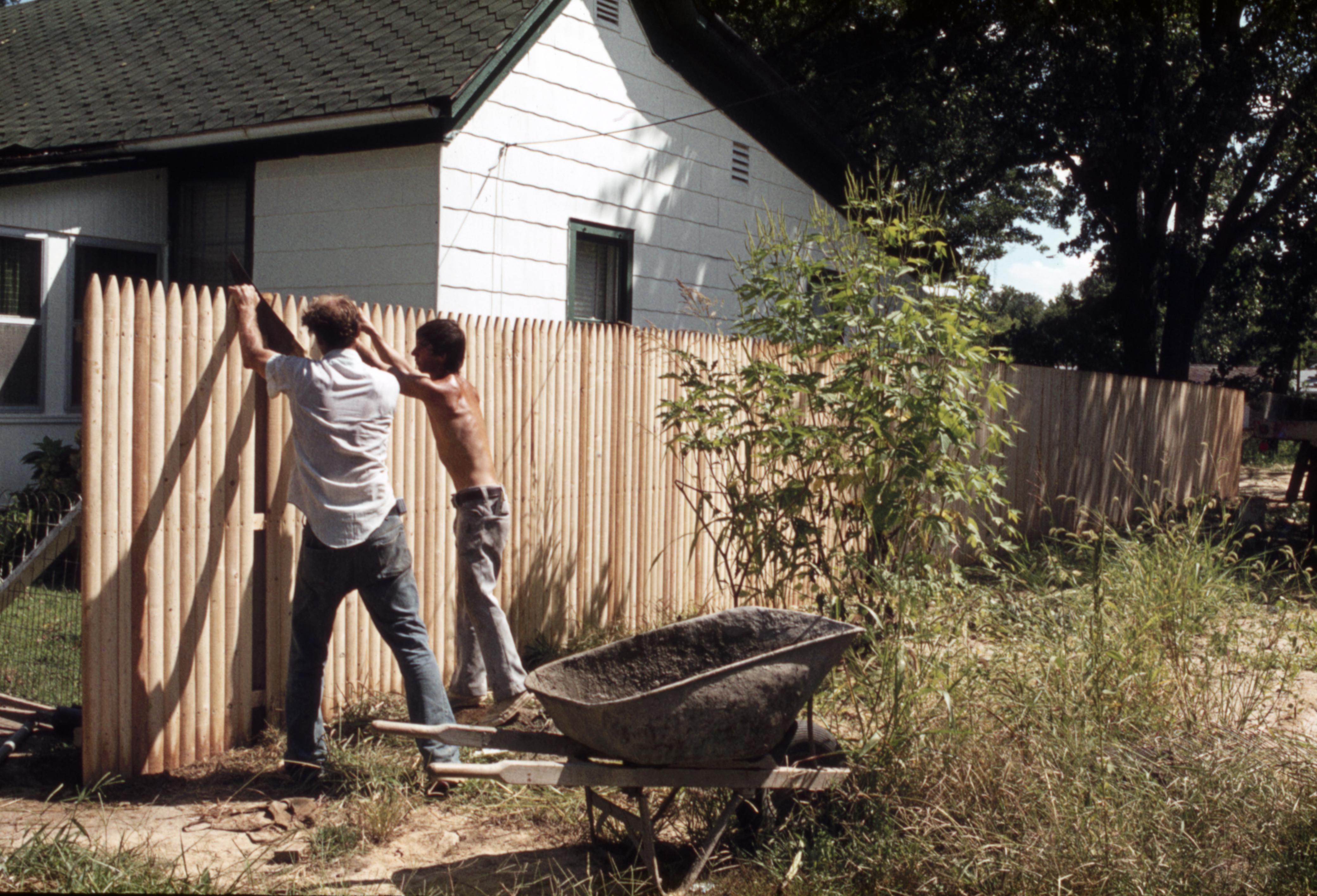 Lanark Development Collection: Construction of 820 Main Street New Harmony Indiana. Workmen finishing of the privacy fence facing South Street.