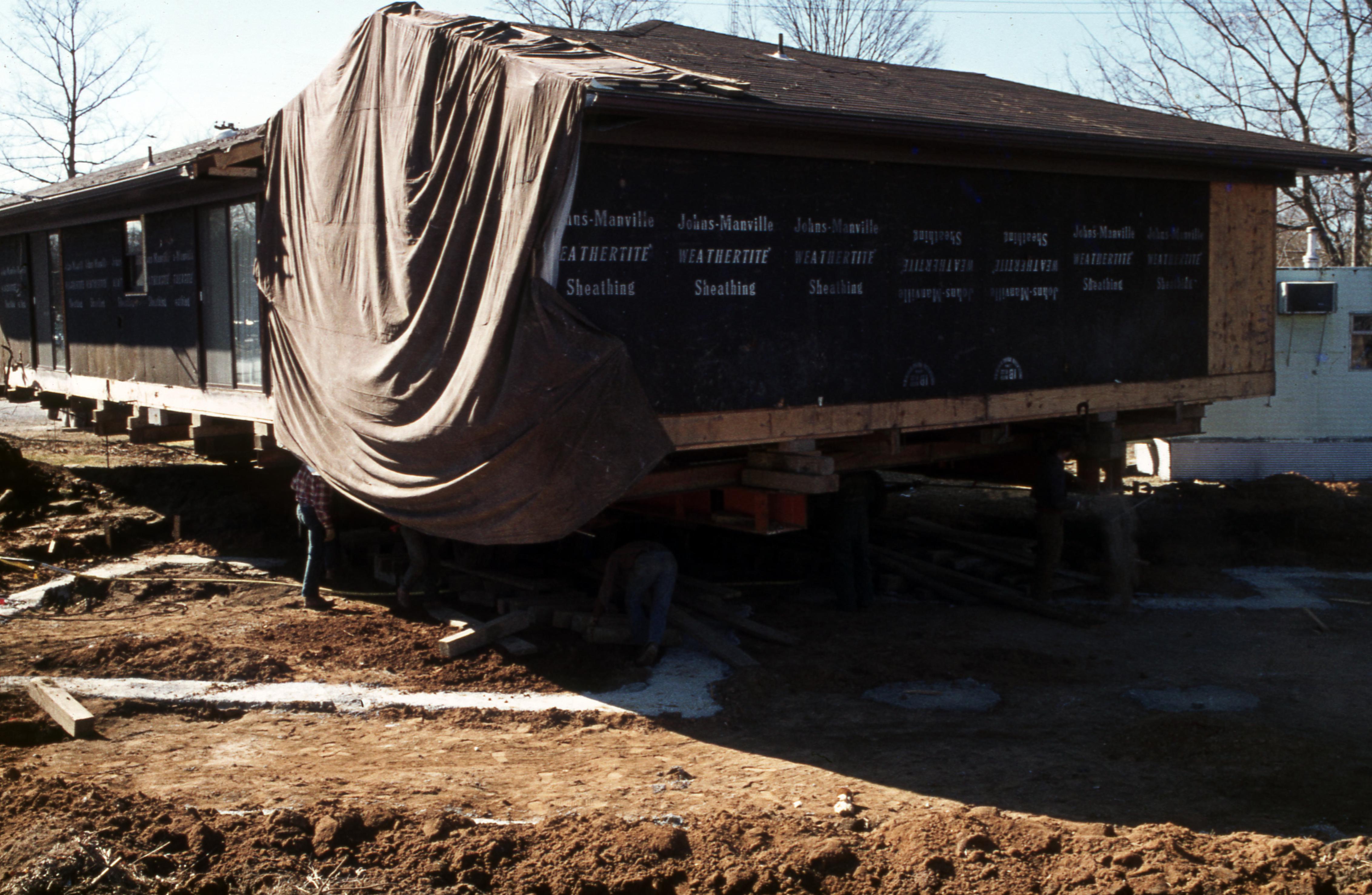 Bauer House: This house was originally located on the north side of North Street in town block 2 C/E. It was moved to the new location at 518 First Street before construction on the Atheneum had begun. Elmer Buchta Moving Engineers was contracted for this and many other building moves during the 1970s. This photo shows the main house being pulled onto the new plat.