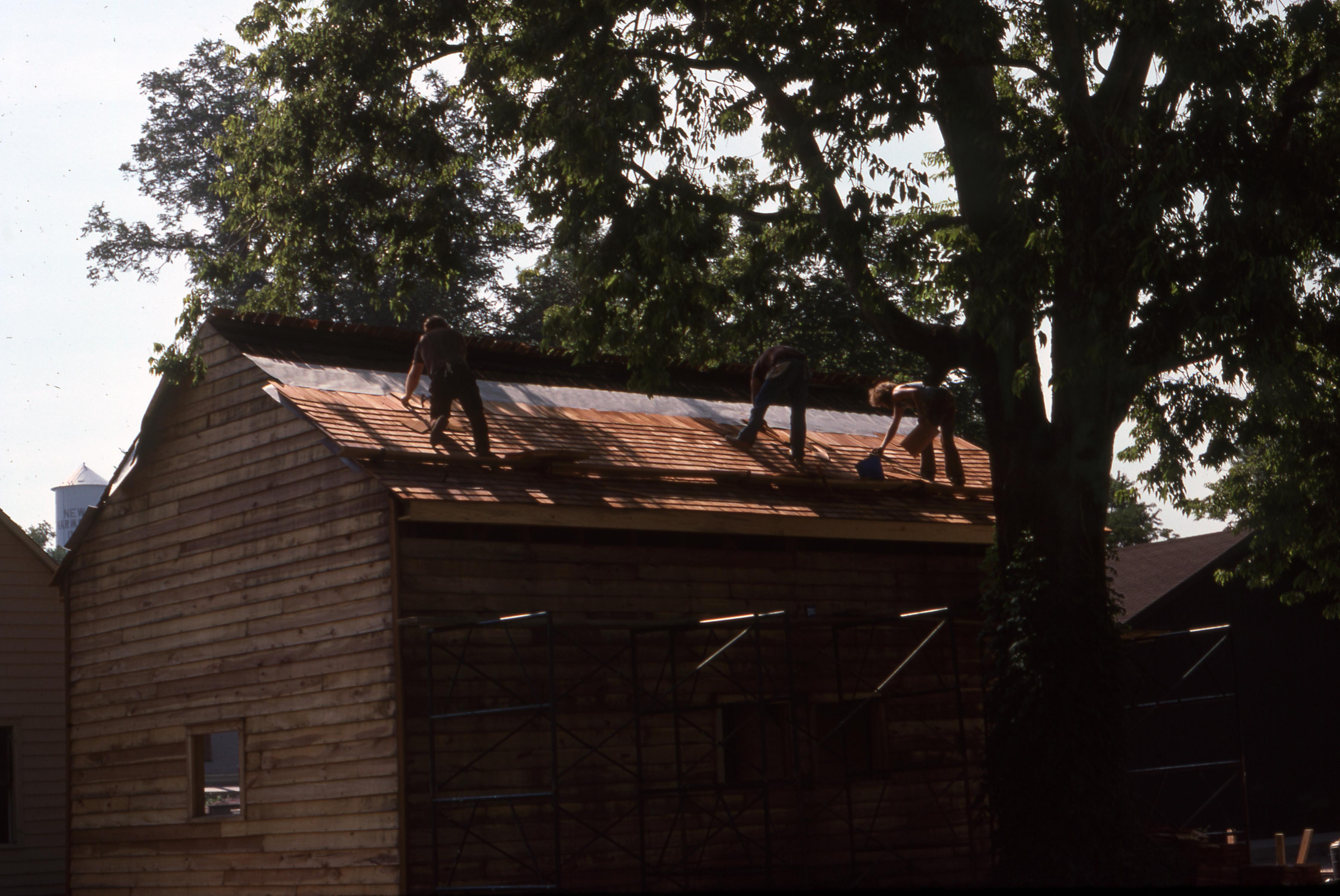 Kemmerling House: The Kemmerling House was relocated from town Block 4 J/SE to the new location at 611 Church Street, beside the Beal House. The Kemmerling House was remodeled into the 1850s Doctor's Office, a gift to the town of New Harmony from Mead Johnson. The Kemmerlings were listed in the 1882 Posey County Directory (as Kimmerlin) as being New Harmony Township farmers. Elmer Buchta Moving Engineers was contracted for this and many other building moves during the 1970s. This photo shows three construction workers installing a new cedar shake roof on the house.