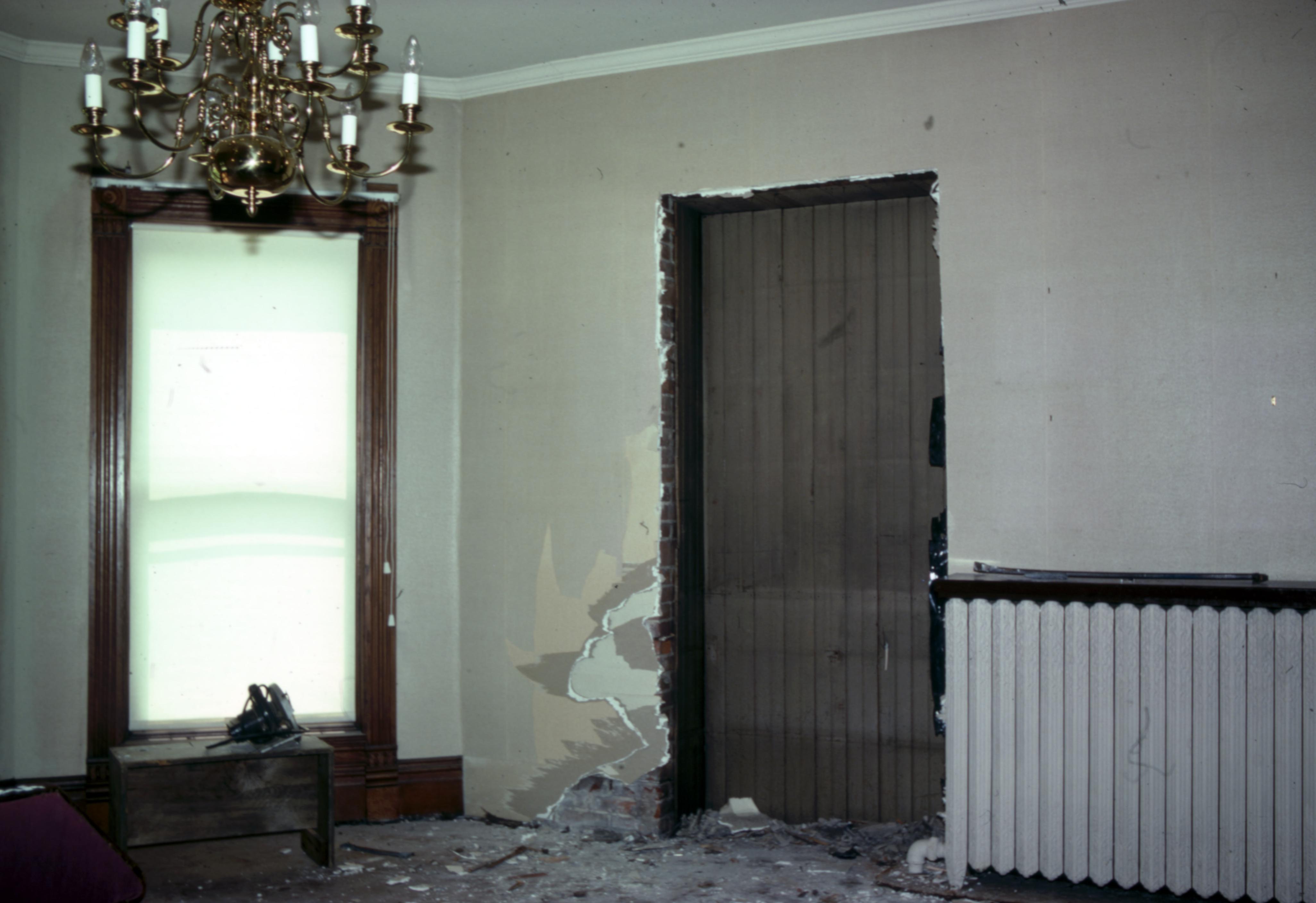 Schnee House: This photo is of the second Schnee home located at 603 West Street and was constructed in 1876. The first Schnee home was constructed during the Rappite occupation of the town, the Schnee brothers having moved to the town from the Quaker colony in Pennsylvania, and that house was located at 517 Tavern Street. The Gypsy Girl Livery Stable was later constructed behind that home. Restoration work occurring in one of the many rooms in the house. An old decorative radiator can be seen in the bottom right of the photo.