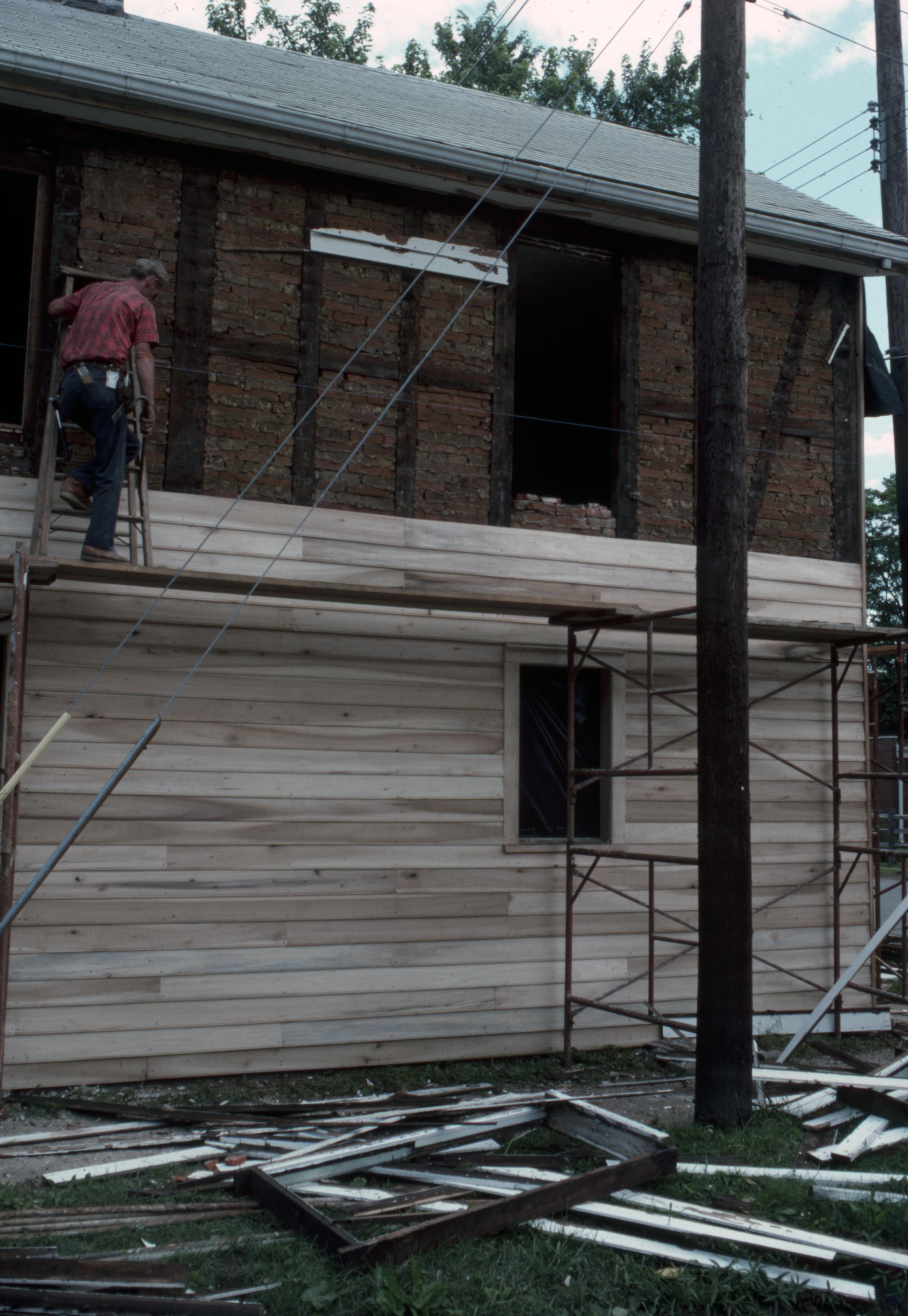 Autrieth House: This house is located at 605 Tavern Street and was constructed in 1855. A worker removes the last of the old board siding from the north side of the house, facing Tavern Street, as new boards are being hung below.