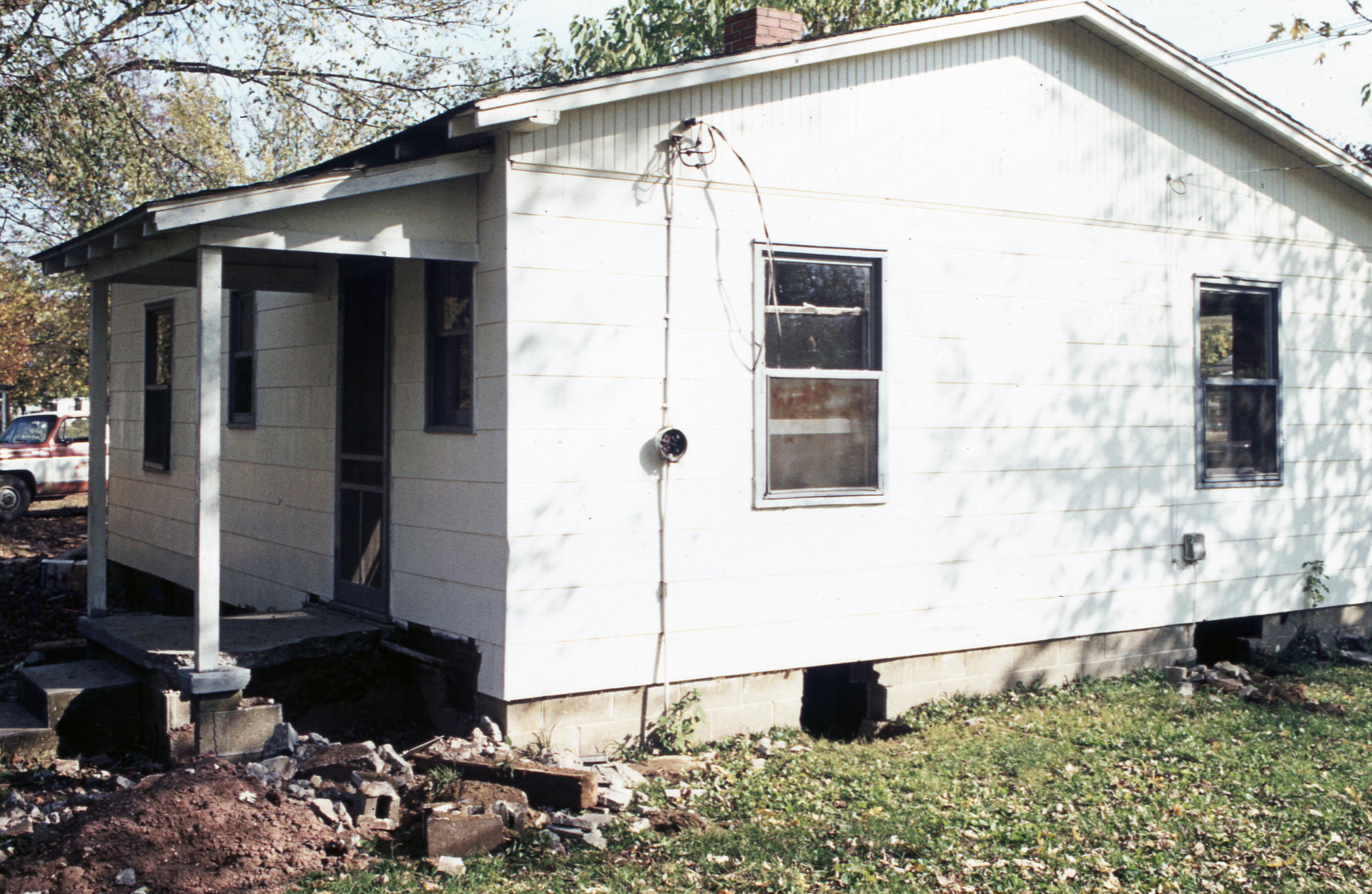 Lewis House: This small house was moved from town block 7 E/SW, one plat east of 718 Main Street, to town block 6 C/SW at 312 Steam Mill Street. It was built in 1890 and at some point after 1975 went through a major remodel after it had been moved. This photo shows the house where it had originally been built before it was moved. The house was moved by Elmer Buchta moving engineers, a company that did most if not all of the moving in New Harmony at this time.