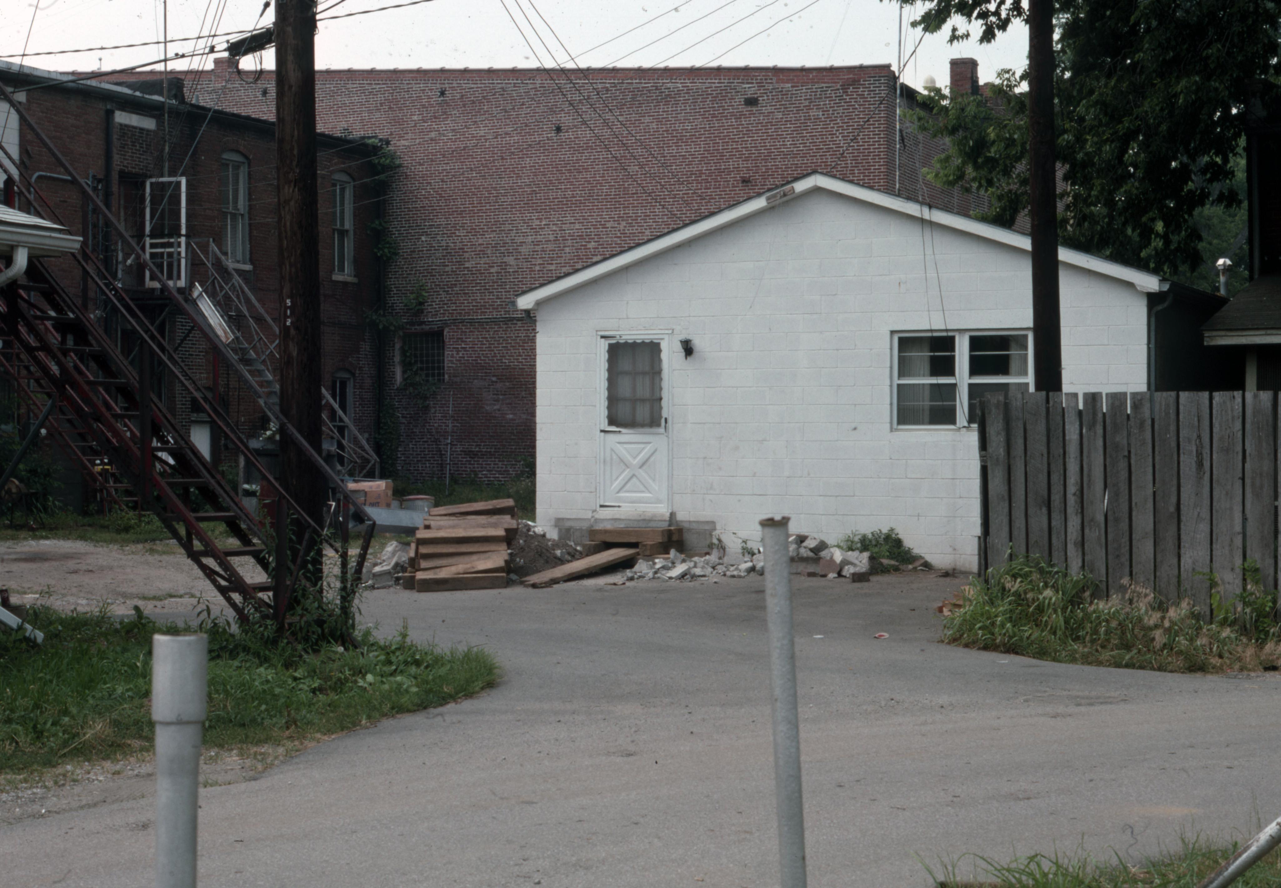 Structure moved from Town Map Block 5 E/N, somewhere behind 511 Tavern Street, towed east down Tavern Street, to South on East Street where it was settled on south east corner plat at East and Steammill Streets. Elmer Buchta Trucking were the movers. This building is no longer present as of 2020. The building on the left side of the photo is the Main Cafe, to the right of that structure is the New Harmony Gallery of Contemporary Art.