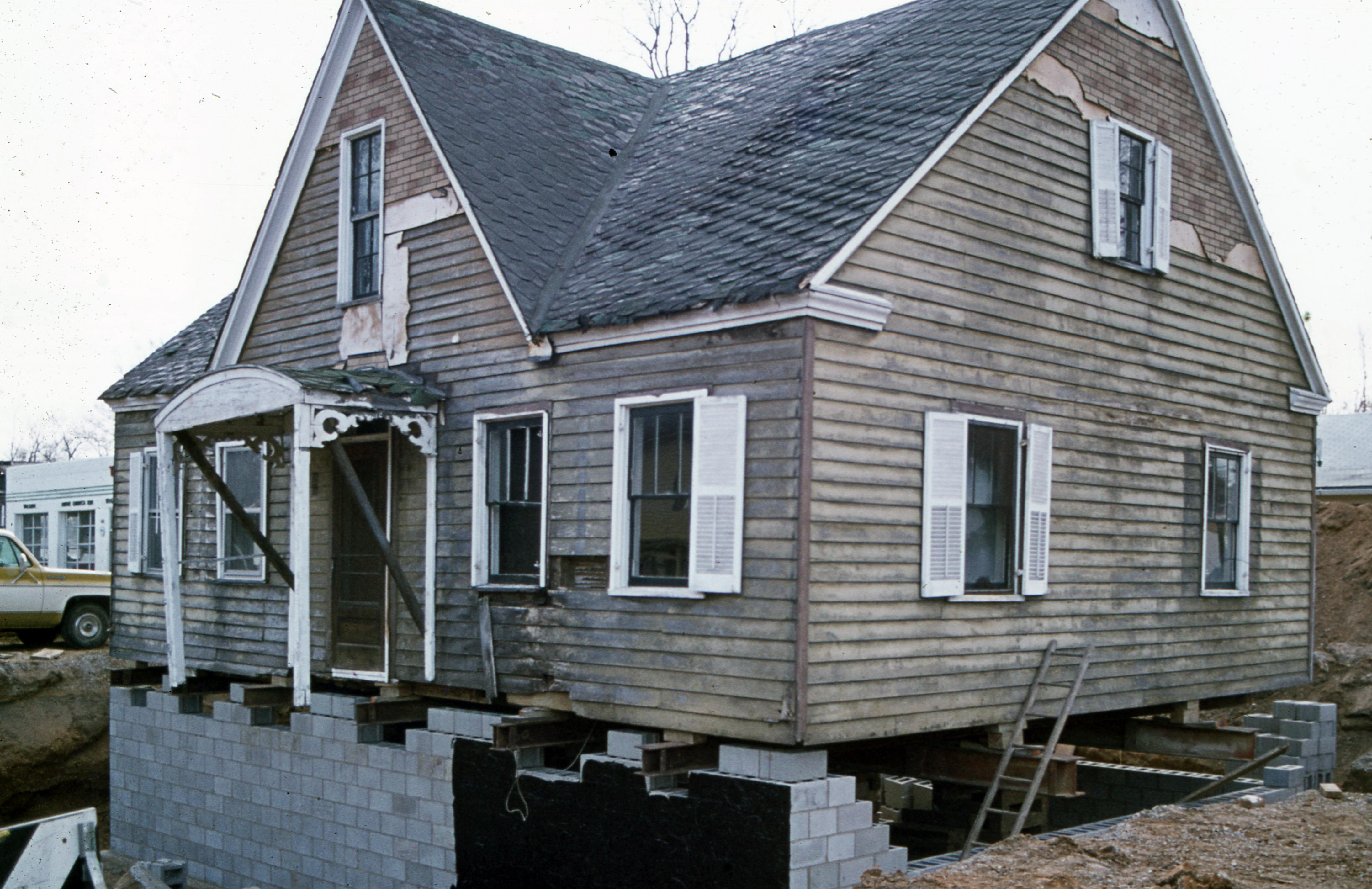 Beal House: The Beal House was moved during the Lanark Construction, on Town Block 8 E/W on Main Street to 611 Church Street. The Beal house was constructed around 1829 by John Beal, who was a carpenter in the Owen and Maclure community. Beal constructed the house from lumber and timbers from an older horse barn. The new location would be the site of the Beal House and 1850s Doctor's Office (The Doctor's Office was a remodel of the Kemmerling House, which was also moved to this site). Elmer Buchta Moving Engineers was contracted for this and many other building moves during the 1970s. This photo shows the new foundation walls being built up to the base of the walls on the Beal House.