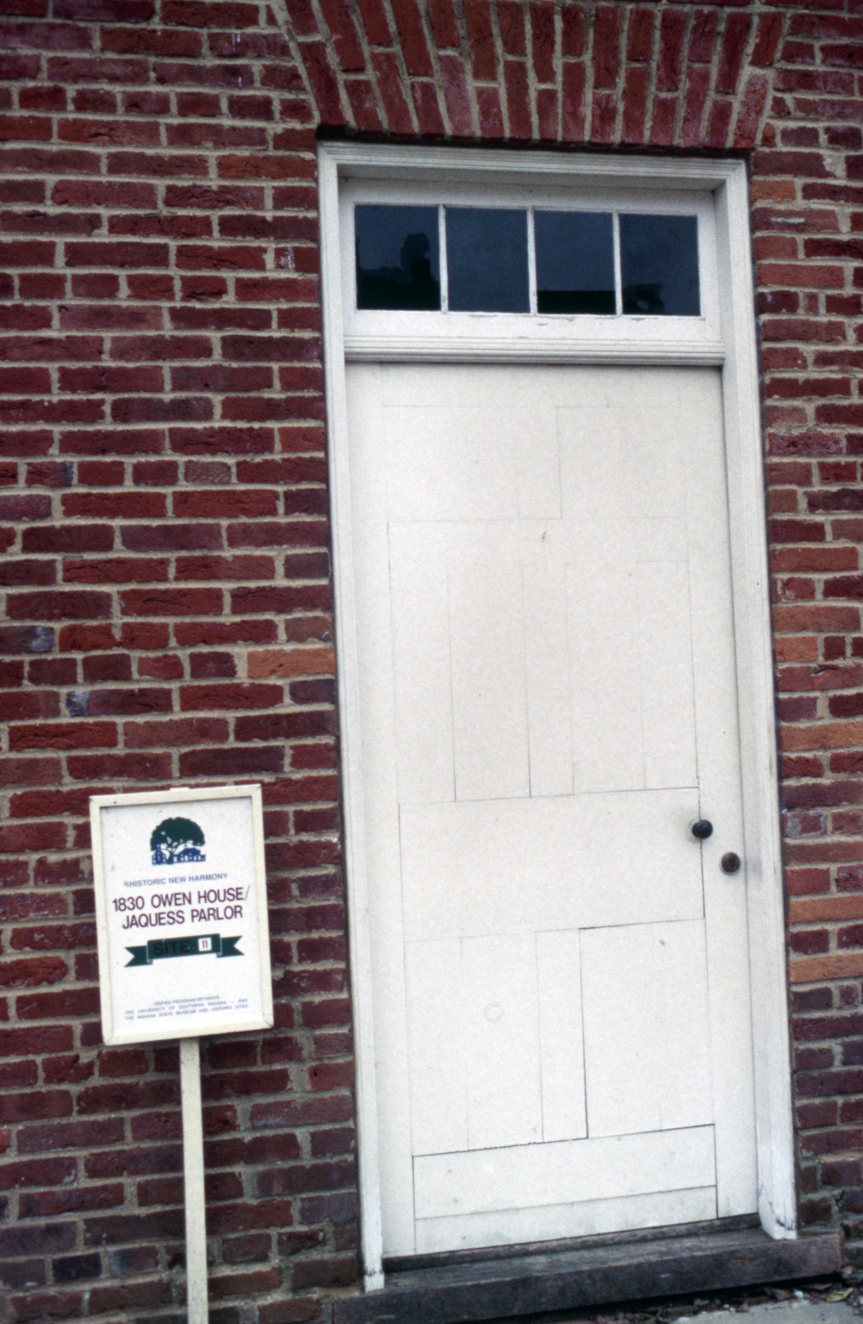 1830 Owen House: Located at 531 Tavern Street. The left front door of the 1830 Owen House. A posted sign, from Historic New Harmony, states this is Site 11, The 1830 Owen House and Jaquess Parlor.