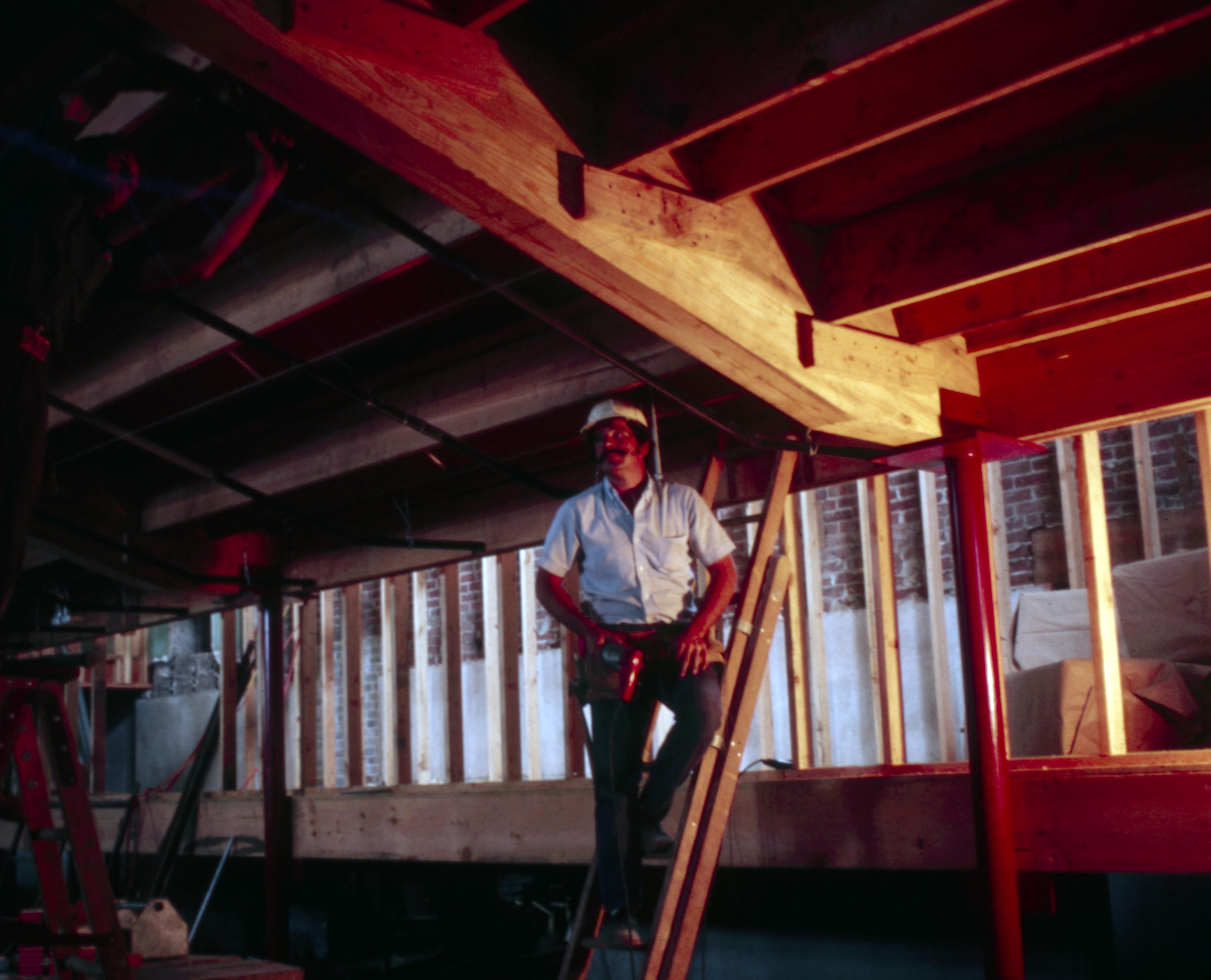 Murphy Auditorium: Murphy Auditorium is located at 419 Tavern Street and was constructed on the plat just east of the Working Men's Institute from 1911 to 1913, using the Doctor Edward Murphy Fund, and was built as part of New Harmony's centennial celebration of 1914. In 2014, the town's bicentennial, Murphy Auditorium became the new home of the concert series Under The Beams, originally housed in the Rapp-Owen Granary. Today, the auditorium is owned by the University of Southern Indiana and is the home of The New Harmony Theater with a seating capacity of 360 people. This photo is a view of the refurbish work occurring inside the auditorium.