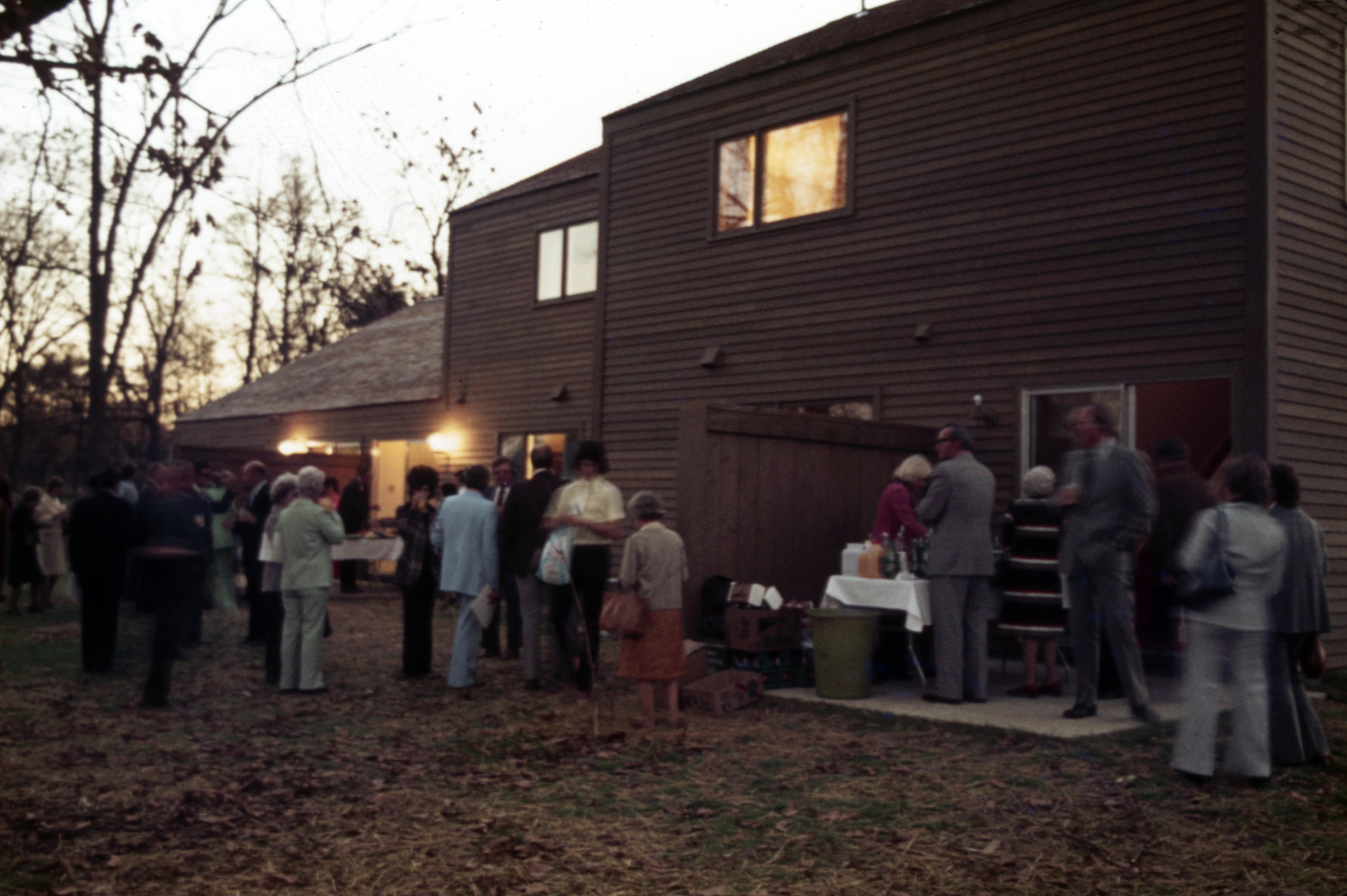 Lanark Development Collection: Construction of 820 Main Street New Harmony Indiana. Crowd of people outside of the new construction enjoying the evening open house viewing.
