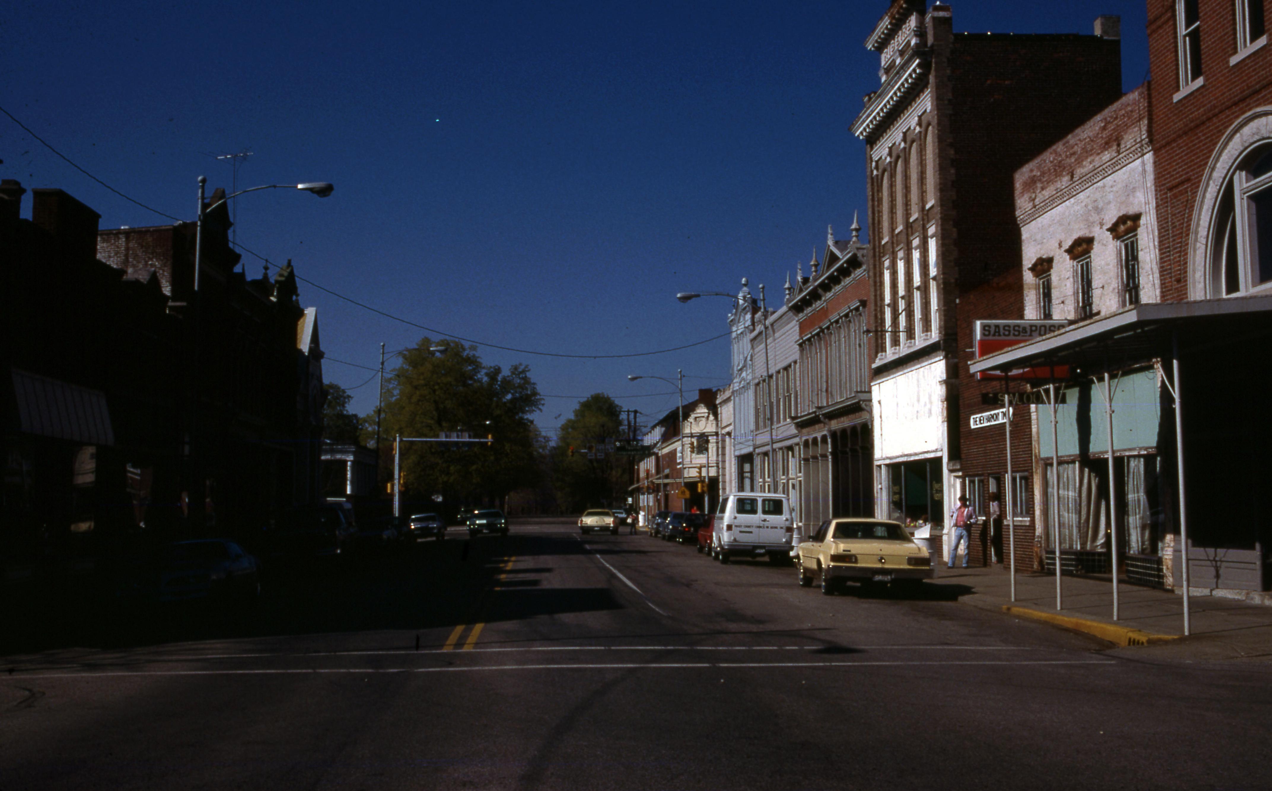 Streets: This is a photo of the businesses along the east side of Main Street, facing north, between Church and Tavern. From right to left: An antique store, Sass and Poss's tavern, The New Harmony Times newspaper, Owen's Variety in the Ribeyre Building, Walz Pharmacy, The Centennial Saloon, The Main Cafe, The Kopper Kettle Gift Shop, The New Harmony Gallery of Contemporary Art, New Harmony Bank & Trust Company which had become the Posey County National Bank, and across Church Street is Wilson's Furniture.