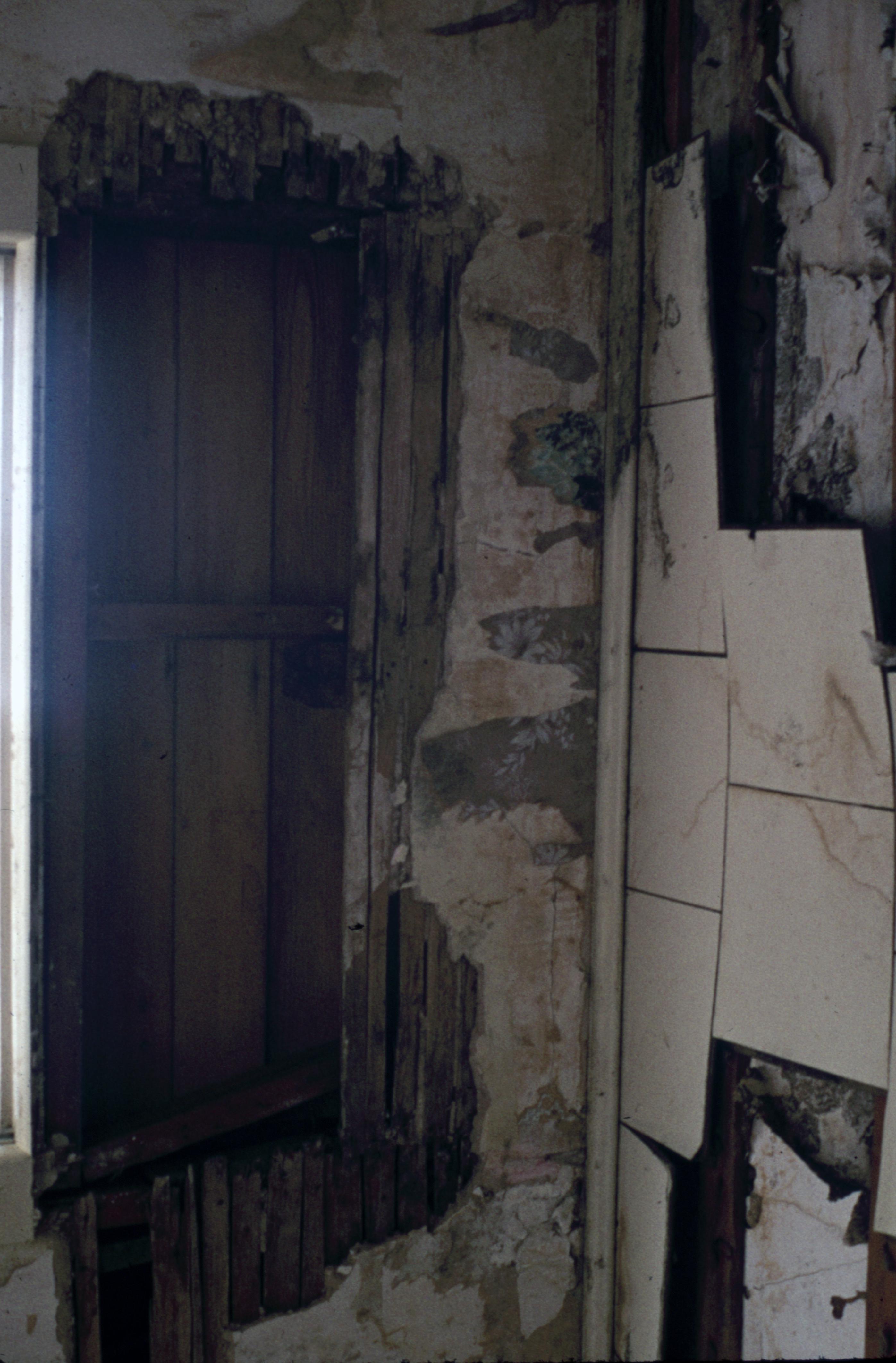 The Jaquess House: This is a photo of the Jaquess House, from which the parlor was taken, was moved from somewhere near Poseyville. It was then taken through a field to near the edge of a highway where it was dismantled. The parlor was then incorporated into the Owen House on the corner of Tavern and Brewery Streets in town block 6 E east. In this photo the house is at the location where is was dismantled. This is one of the walls showing the original studs. The house was moved by Elmer Buchta moving engineers, a company that did most if not all of the moving in New Harmony at this time.