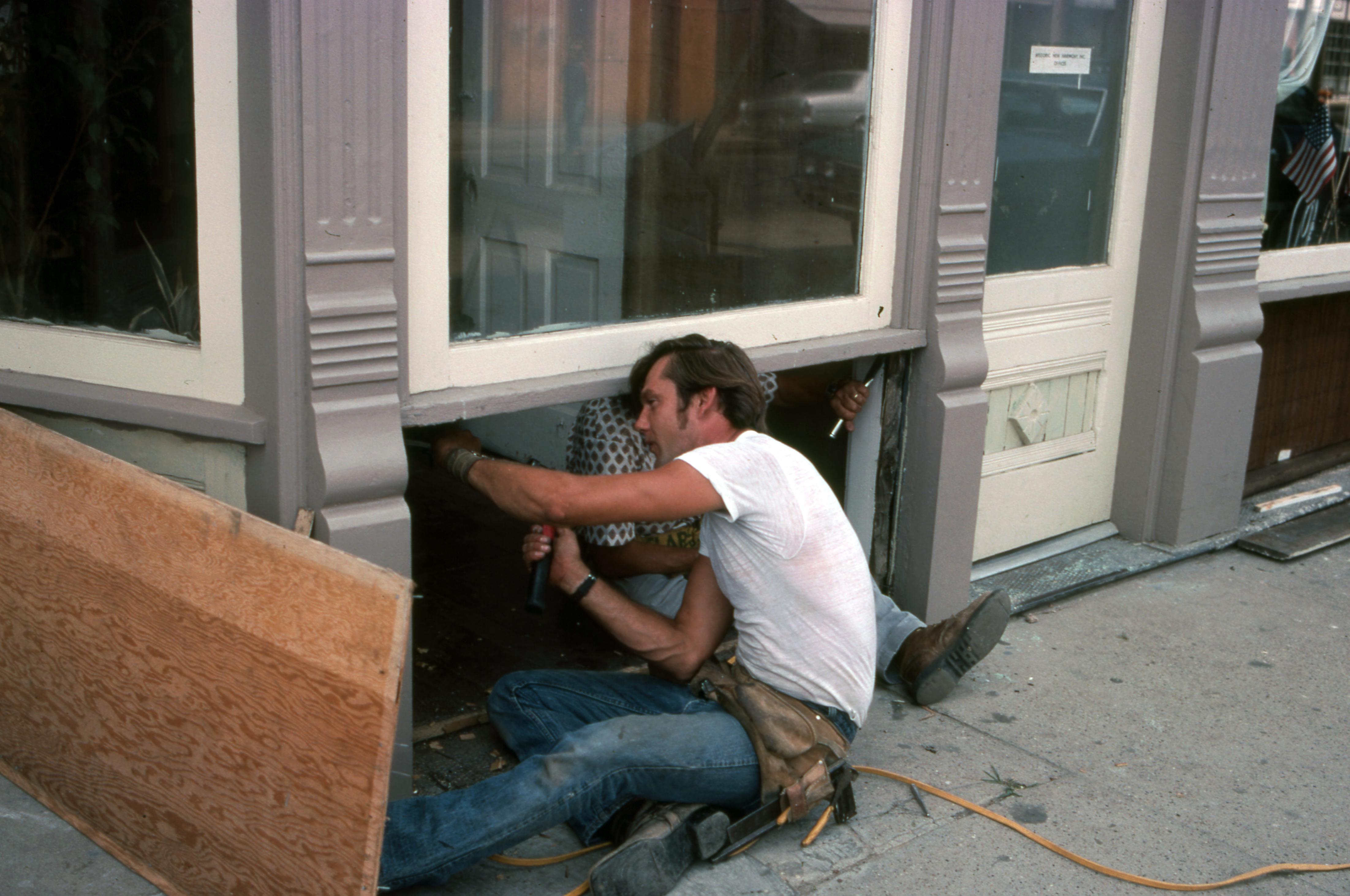 J. Breith Building: This building is located at 506 Main Street. The building started as a one-story wooden structure built by Jacob Breith (UA58 � 7516 far left) as a pharmacy and grocery store. The original building was demolished to make room for the new two-story brick structure at some point between 1893 and 1899. The Historic New Harmony Office was located on the second floor of the building in the early 1970s. The Kopper Kettle Gift Shop was located in the J. Breith Building during the early 1970s. After the J. Breith Building was renovated, it became home to the Imoko Plants shop, very briefly, before becoming a part of the New Harmony Gallery of Contemporary Art as the sales floor. This is a photo of construction workers doing renovation work to the front face of the building.