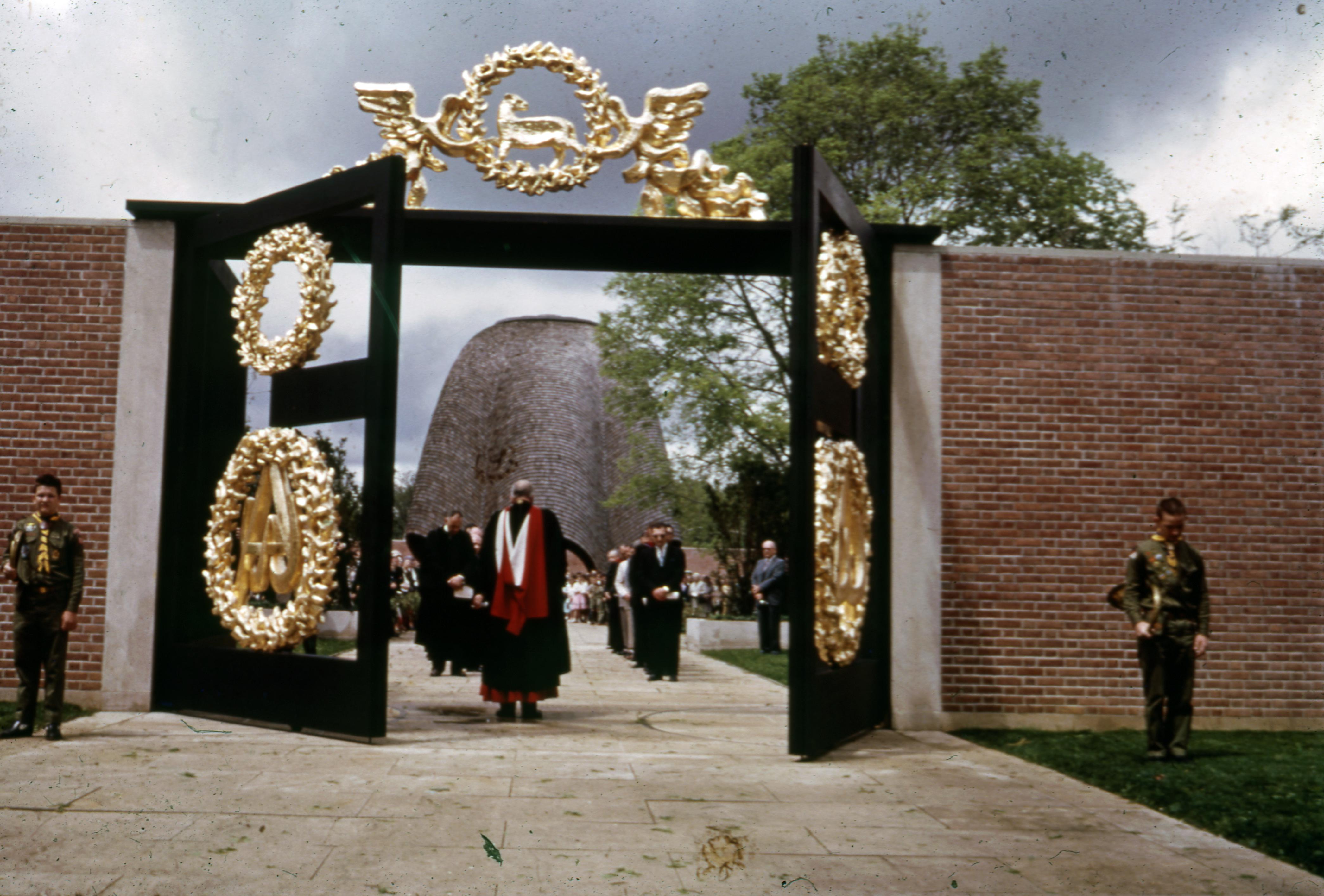 Group walking through the east gates during a ceremony being held at the Roofless Church. The Roofless Church is located at 420 and was commissioned by the late Jane Blaffer Owen and built by architect Philip Johnson. The inter-faith church was dedicated in 1960 and is open to the public.