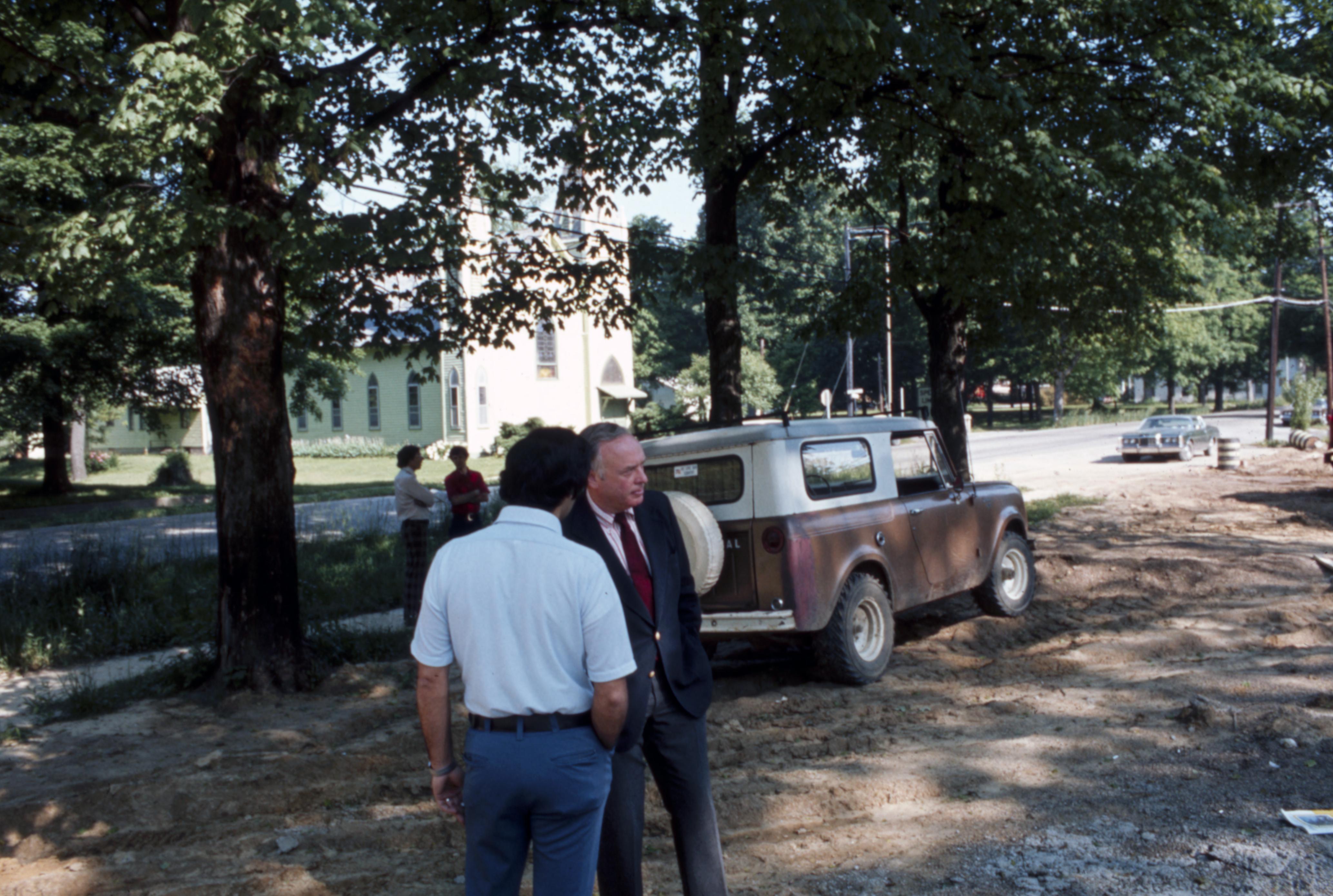 Lanark Development Collection: Construction of 820 Main Street New Harmony Indiana. Men working on the construction of the new building. Holy Angel's Catholic church can be seen across Main Street in the center of the photo.
