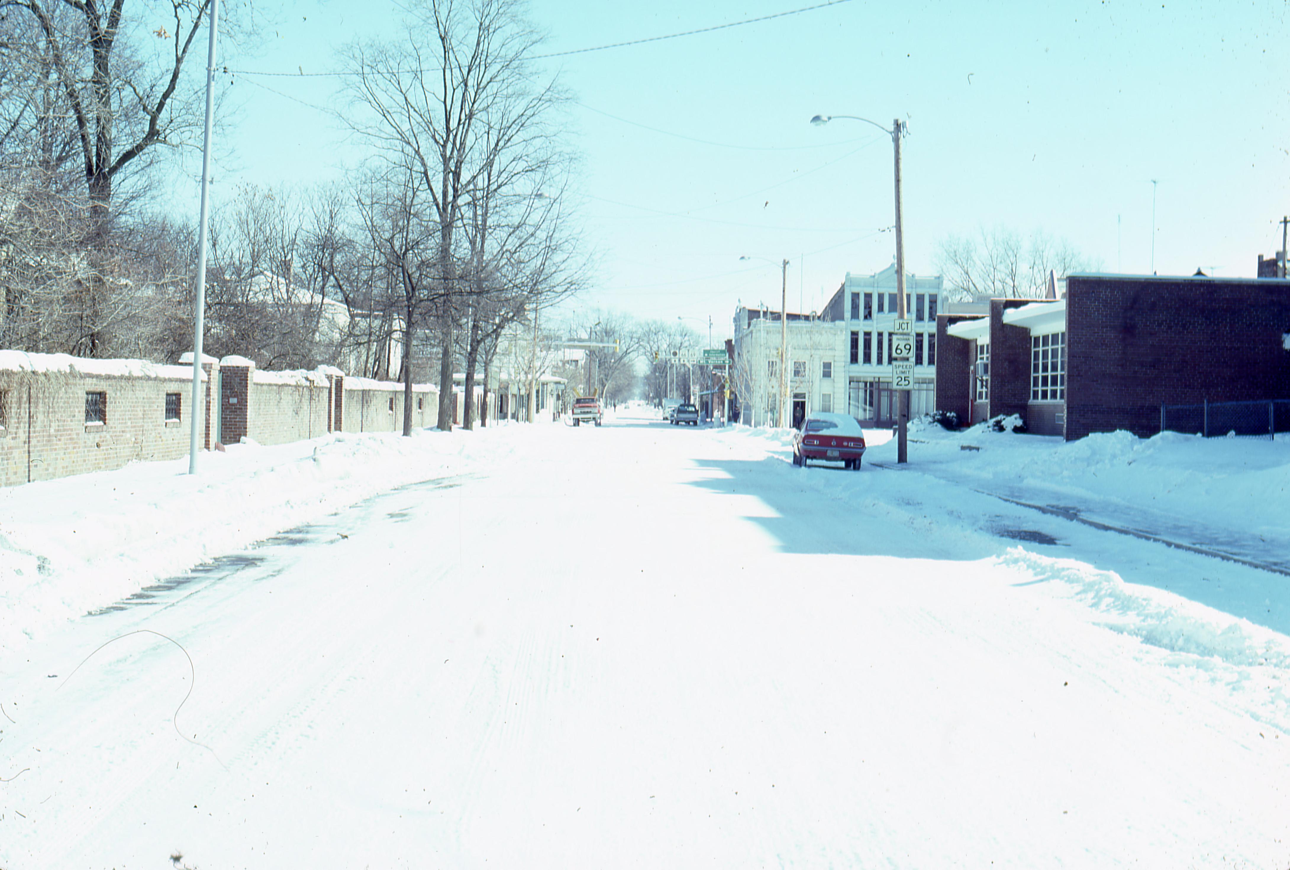 Streets: Church Street, facing east, from the corner with West Street taken after a snow. Note The old New Harmony School building on the right side of the photo and the Maclure House on the left.