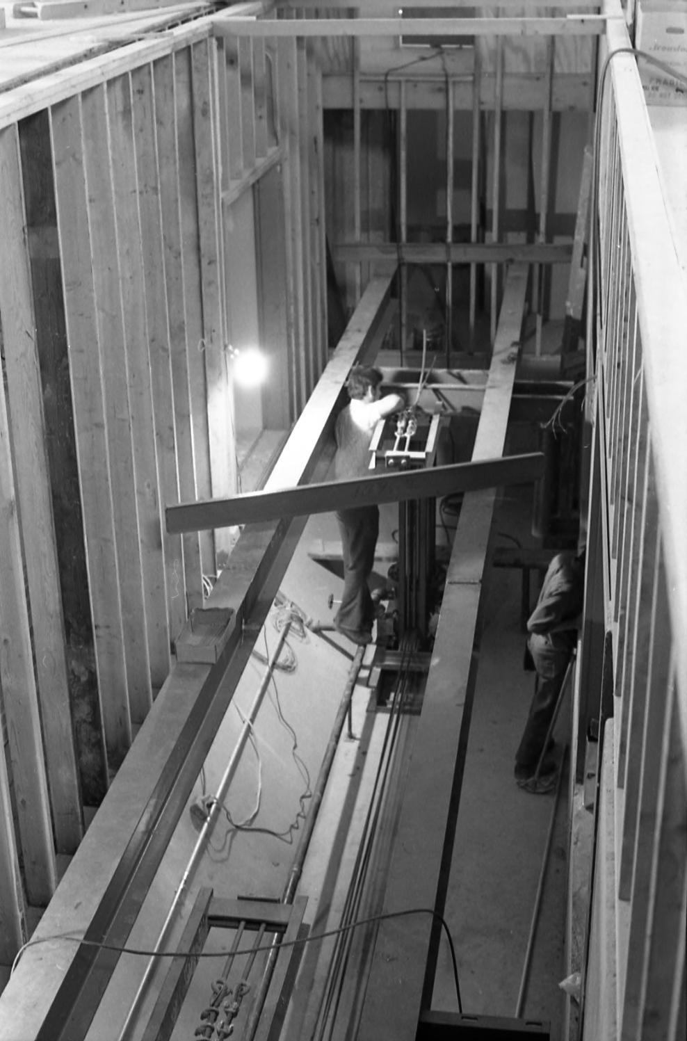 Transparencies and Negatives Collection: Historic photographs. Murphy Auditorium is located at 419 Tavern Street and was constructed on the plat just east of the Working Men's Institute from 1911 to 1913, using the Doctor Edward Murphy Fund, and was built as part of New Harmony's centennial celebration of 1914. In 2014, the town's bicentennial, Murphy Auditorium became the new home of the concert series Under the Beams, originally housed in the Rapp-Owen Granary. Today, the auditorium is owned by the University of Southern Indiana and is the home of The New Harmony Theater with a seating capacity of 360 people. This is a photo of construction on the stage lift.