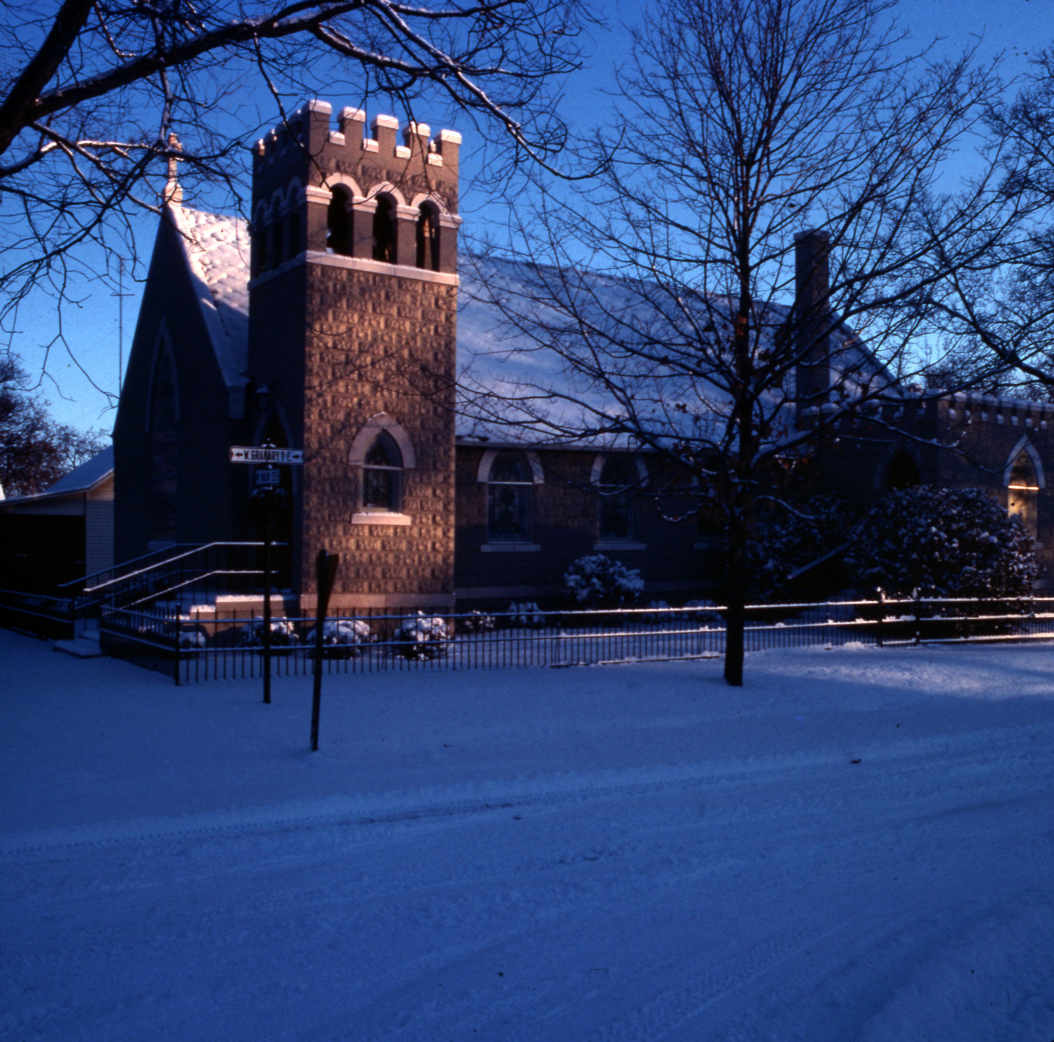 St. Stephen's Episcopal Church: The church was first organized in 1841 and in 1843 the west wing of the old Rappite church was given for use by the Episcopal�s by Alexander and Anne Maclure. At this time the old burial ground was also given to the church, which was bought back by the Rappites in 1846. Then in 1850 the Episcopal�s sold the west wing of the old Rappite Church for $1000 and in 1854 St. Stephen�s Church was constructed, the North Street location where the Lenz House now resides.1888 saw the construction of a new belfry add to the church to accommodate the new bell. In 1911 the new church was built, and an addition was made to it in 1927. The church is still present as of 2022. This is a photo of the south side of the church after a snowfall.