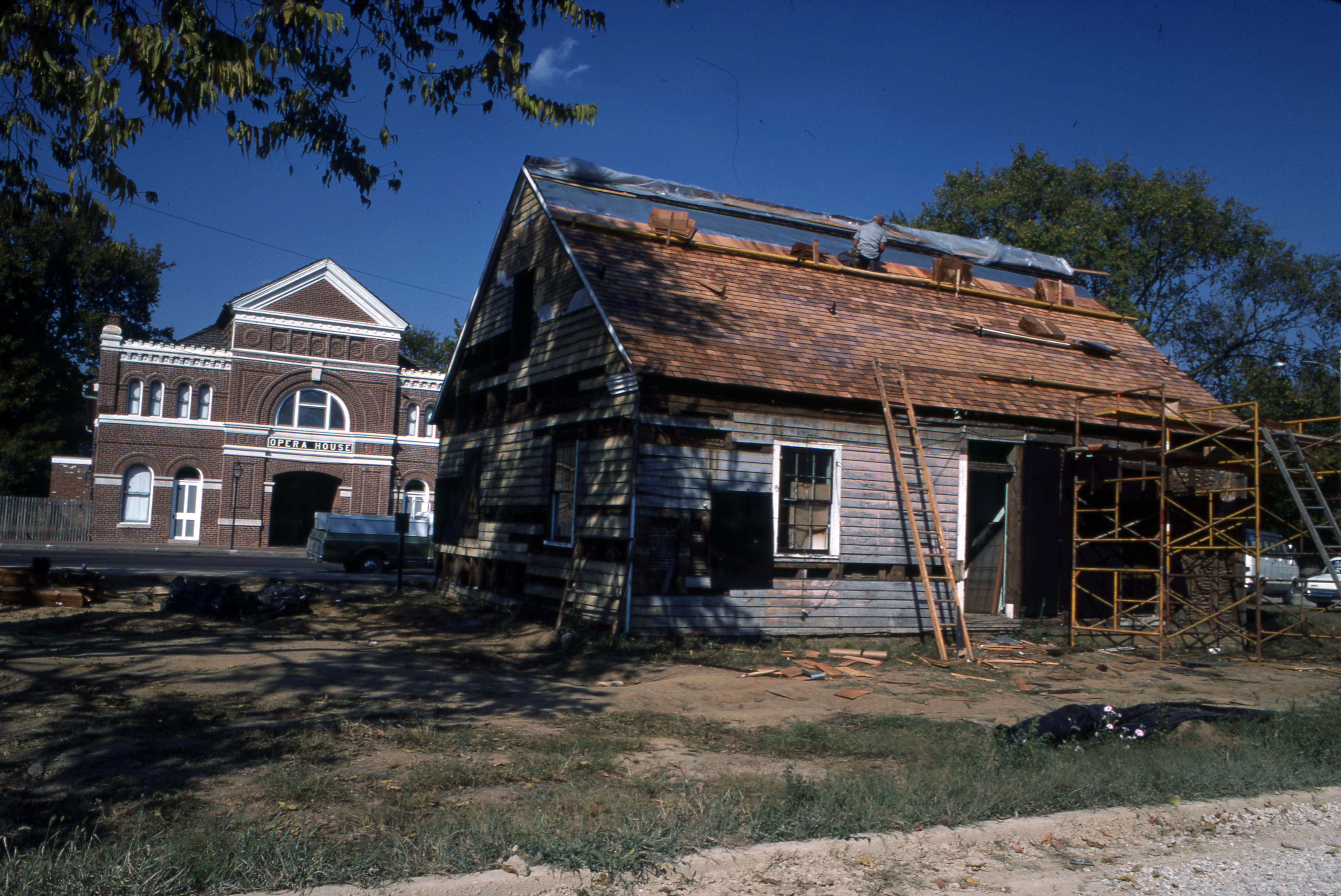 Beal House: The Beal House was moved during the Lanark Construction, on Town Block 8 E/W on Main Street to 611 Church Street. The Beal house was constructed around 1829 by John Beal, who was a carpenter in the Owen and Maclure community. Beal constructed the house from lumber and timbers from an older horse barn. The new location would be the site of the Beal House and 1850s Doctor's Office (The Doctor's Office was a remodel of the Kemmerling House, which was also moved to this site). Elmer Buchta Moving Engineers was contracted for this and many other building moves during the 1970s. In this photo the old clapboards are being stripped off the timber frame walls. A section, on the right side of the house, was left exposed, under glass, to show this old type of construction. The roof is being replaced with new cedar shakes. On the left side of the photo, across Church Street, is Thrall's Opera House.