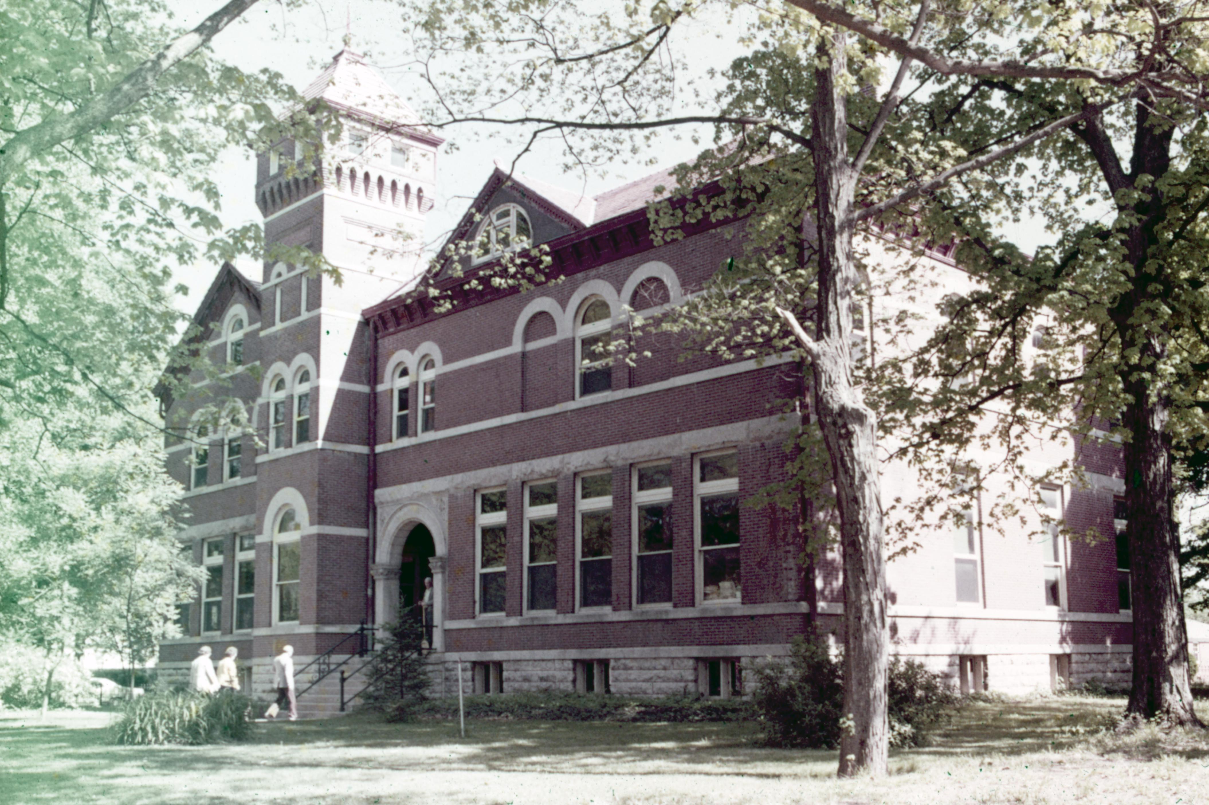 Working Men's Institute: This building is located 407 Tavern Street. The Working Men's Institute was founded in 1838, by William Maclure, as a library for working people, not just those who were wealthy. Initially there were a total of 160 Working Men's Institutes, 144 in the state of Indiana and 16 in the state of Illinois, however, the one in New Harmony Indiana is the only one which still remains. The present location of the WMI was completed in 1894, now a National Historic Landmark, before this it was housed in the old Harmonist Church from 1834 until the new building was completed. The WMI also houses a museum as well as the oldest working library in the state of Indiana. This photo shows the northwest corner of the WMI taken from West Street.