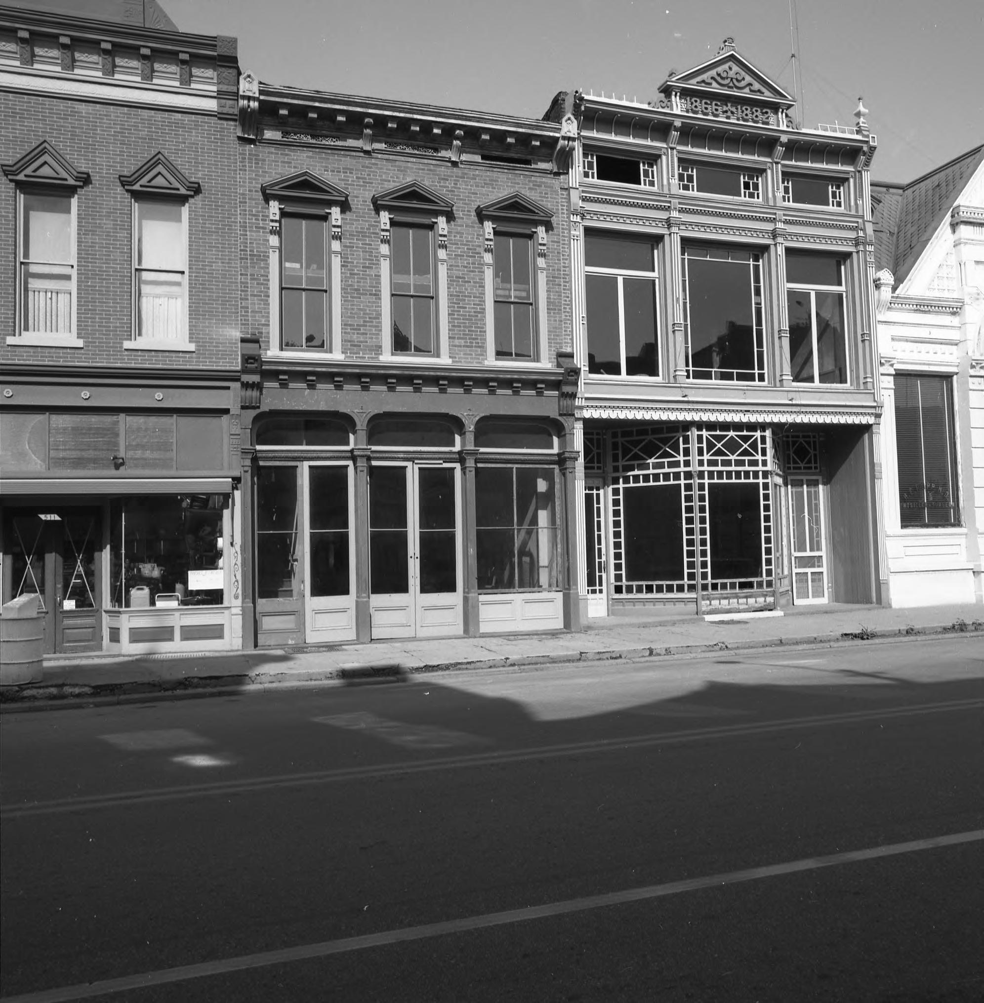 Transparencies and Negatives Collection: Historic photographs. This is a photo of the west side of Main Street between Church and Tavern. The photo shows some of the buildings as they were undergoing refurbishment during the 1970s.
