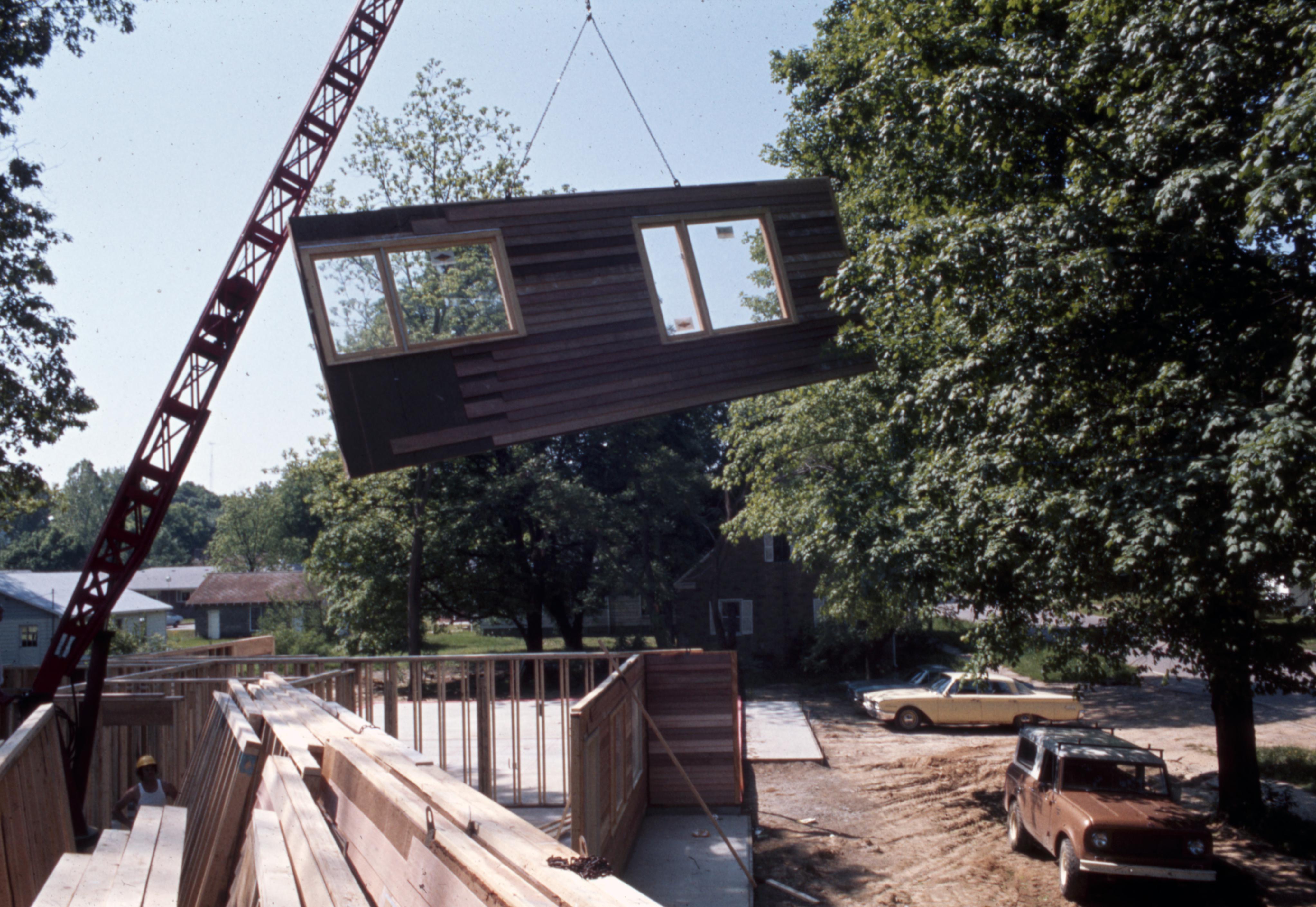 Lanark Development Collection: Buildings which were demolished during the construction of 820 Main Street New Harmony Indiana. Men working on the construction of the new building. The building on the far left of the photo was moved to one block north of The Posey County News on 3rd Street, New Harmony, Indiana. The house behind the yellow car was later moved. The gray Barrett House in the center was also moved. Main Street can be seen on the far right side of the photo. The yellow car is a 1960 Ford Galaxie 4 door. The car behind the Galaxie is a 1968 or 1969 Chevy El Camino.
