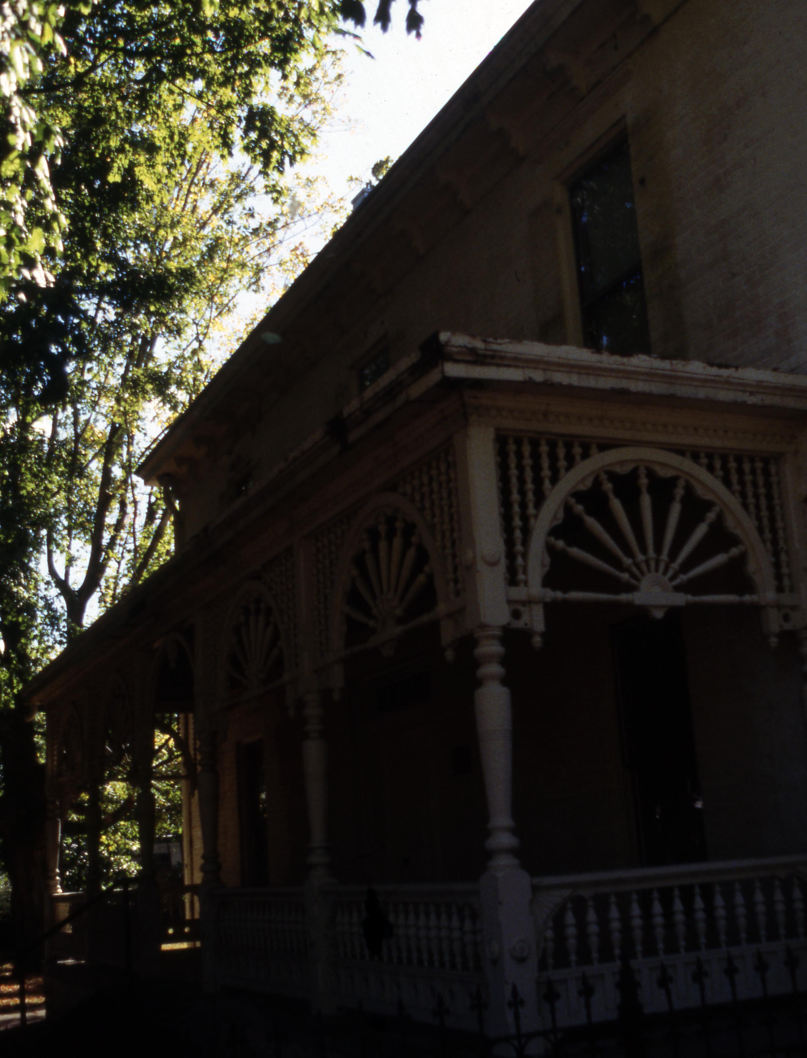 Schnee House: This photo is of the second Schnee home located at 603 West Street and was constructed in 1876. The first Schnee home was constructed during the Rappite occupation of the town, the Schnee brothers having moved to the town from the Quaker colony in Pennsylvania, and that house was located at 517 Tavern Street. The Gypsy Girl Livery Stable was later constructed behind that home. This photo shows the northeast corner of the porch nearly 25 years after the old concrete one had been replaced. The photo was taken from the corner of West and Tavern Streets.
