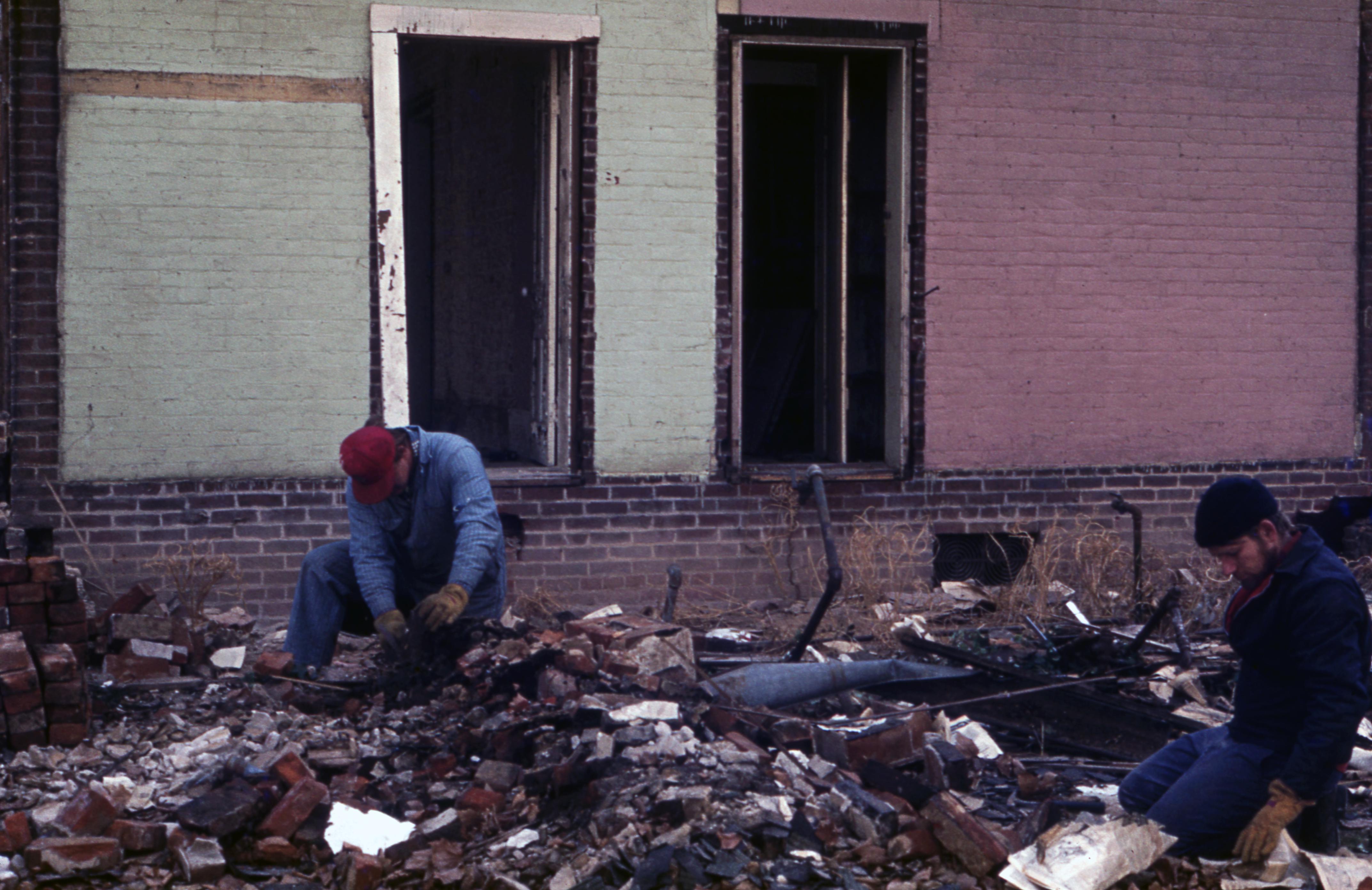 Patterson House: Located at 682 Arthur Street and built in 1850. Construction workers are sorting through rubble left from the demolition of the old north wall addition.