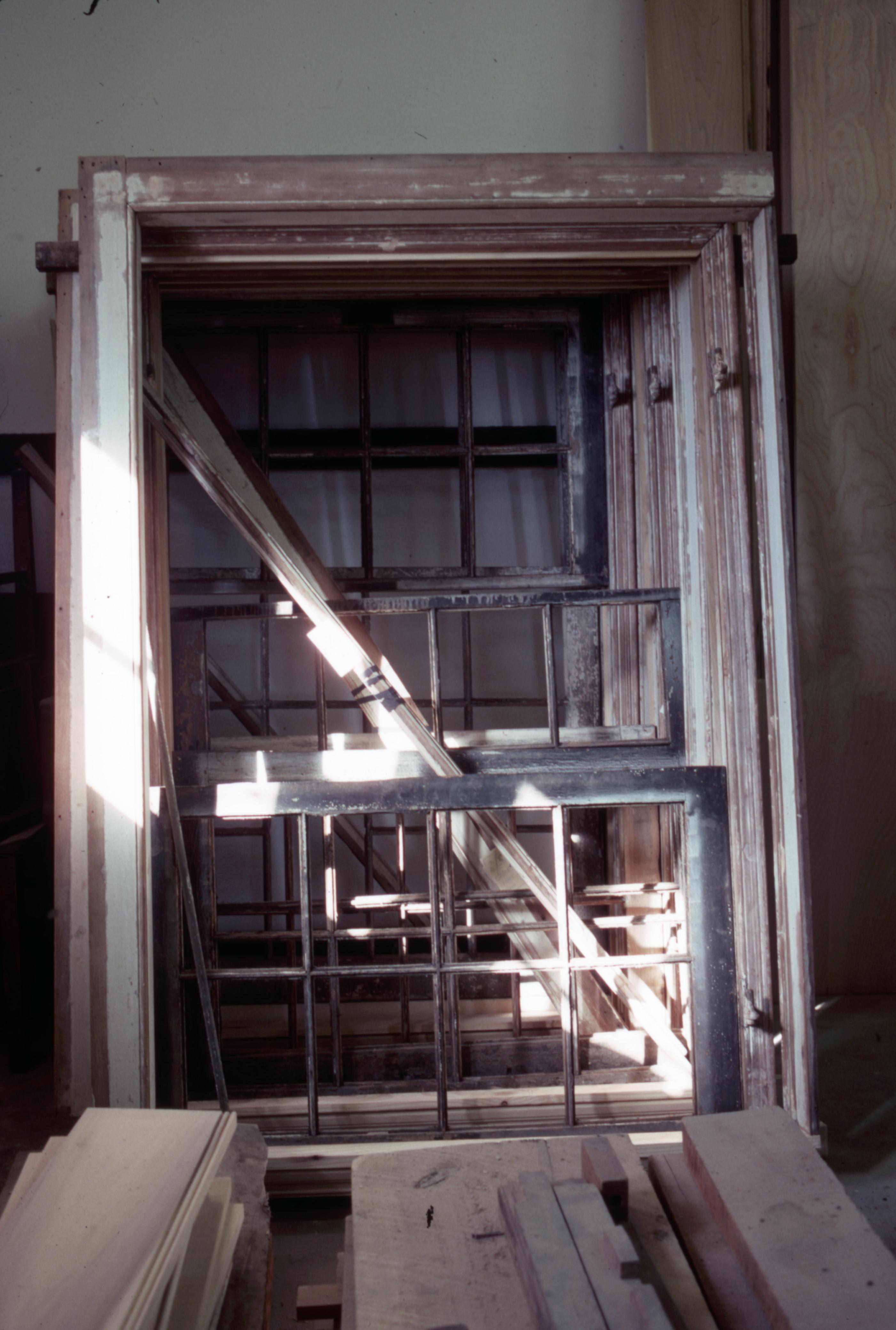 1831 Owen House: The Inside of the 1830 Owen House as it was under construction. A stack of old windows can be seen leaning against the wall.