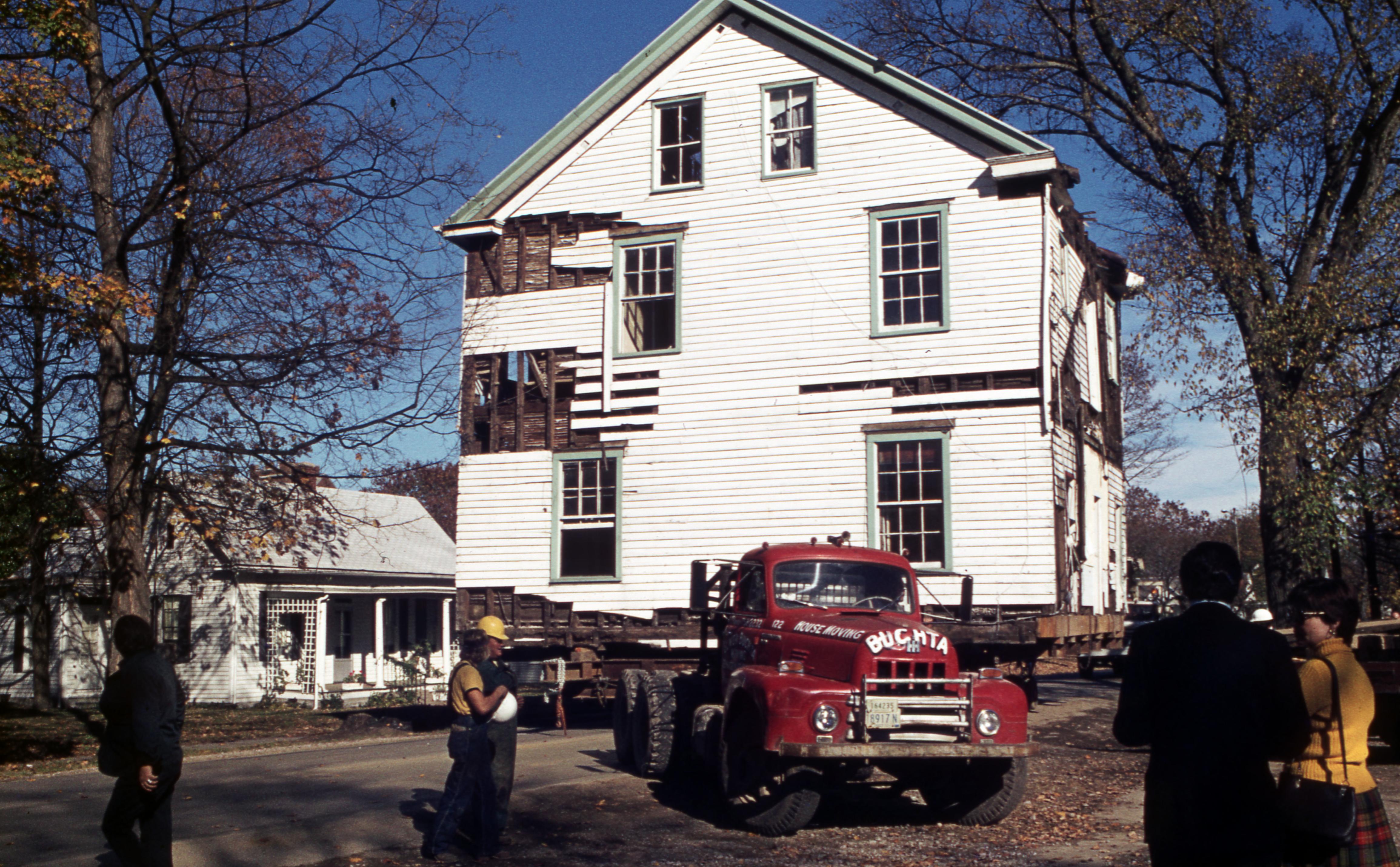 Golden House: This building was moved from the plat of 807 Church, what is now 811 Church Street, to one plat west of 723 E. Church Street but has since been demolished, most likely when the house at 707 E. Church was built in 2009. Elmer Buchta Moving Engineers was contracted for this and many other building moves during the 1970s. This photo shows the Golden House beginning to make the turn onto the new plat location. On the left side of the photo is the house which was one plat east of 712 Church Street, later either demolished or moved.