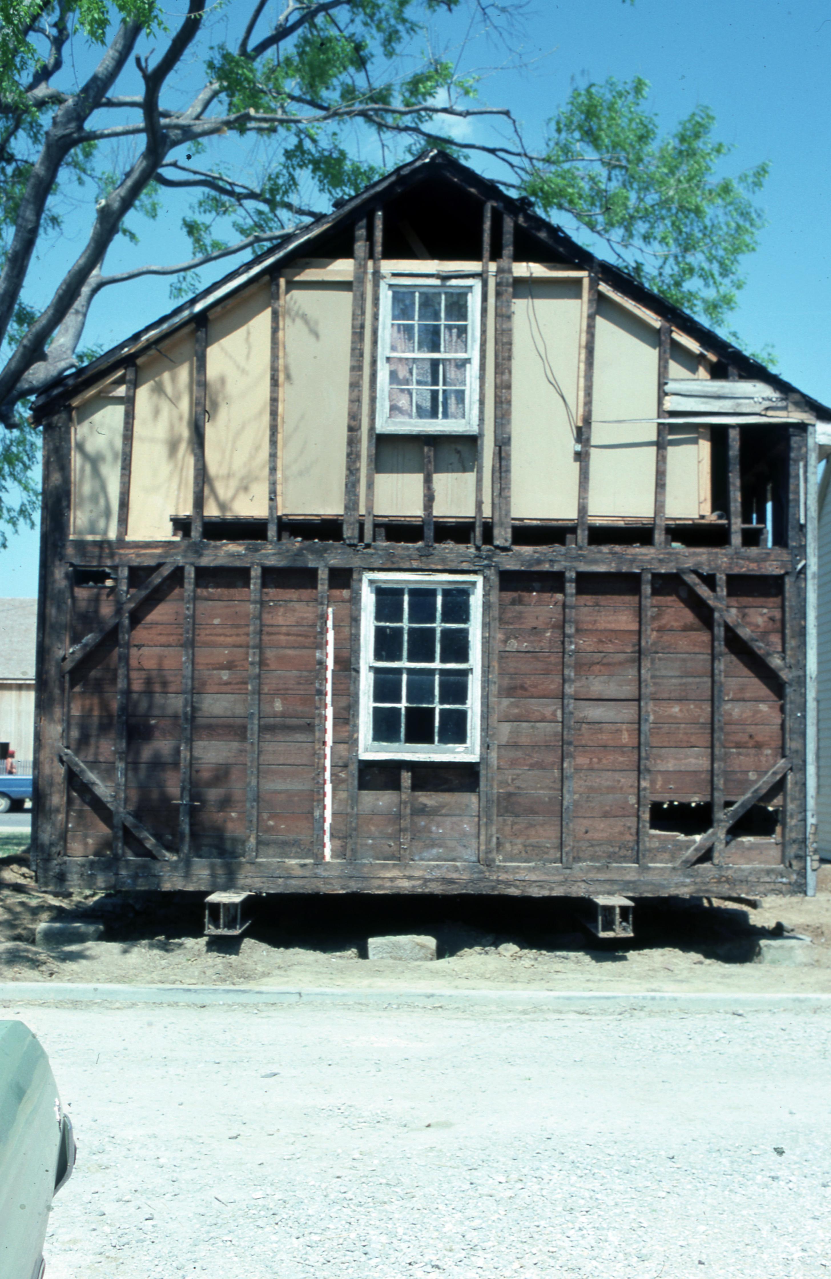 Kemmerling House: The Kemmerling House was relocated from town Block 4 J/SE to the new location at 611 Church Street, beside the Beal House. The Kemmerling House was remodeled into the 1850s Doctor's Office, a gift to the town of New Harmony from Mead Johnson. The Kemmerlings were listed in the 1882 Posey County Directory (as Kimmerlin) as being New Harmony Township farmers. Elmer Buchta Moving Engineers was contracted for this and many other building moves during the 1970s. This photo shows the south wall of the house with its exposed timber framing.