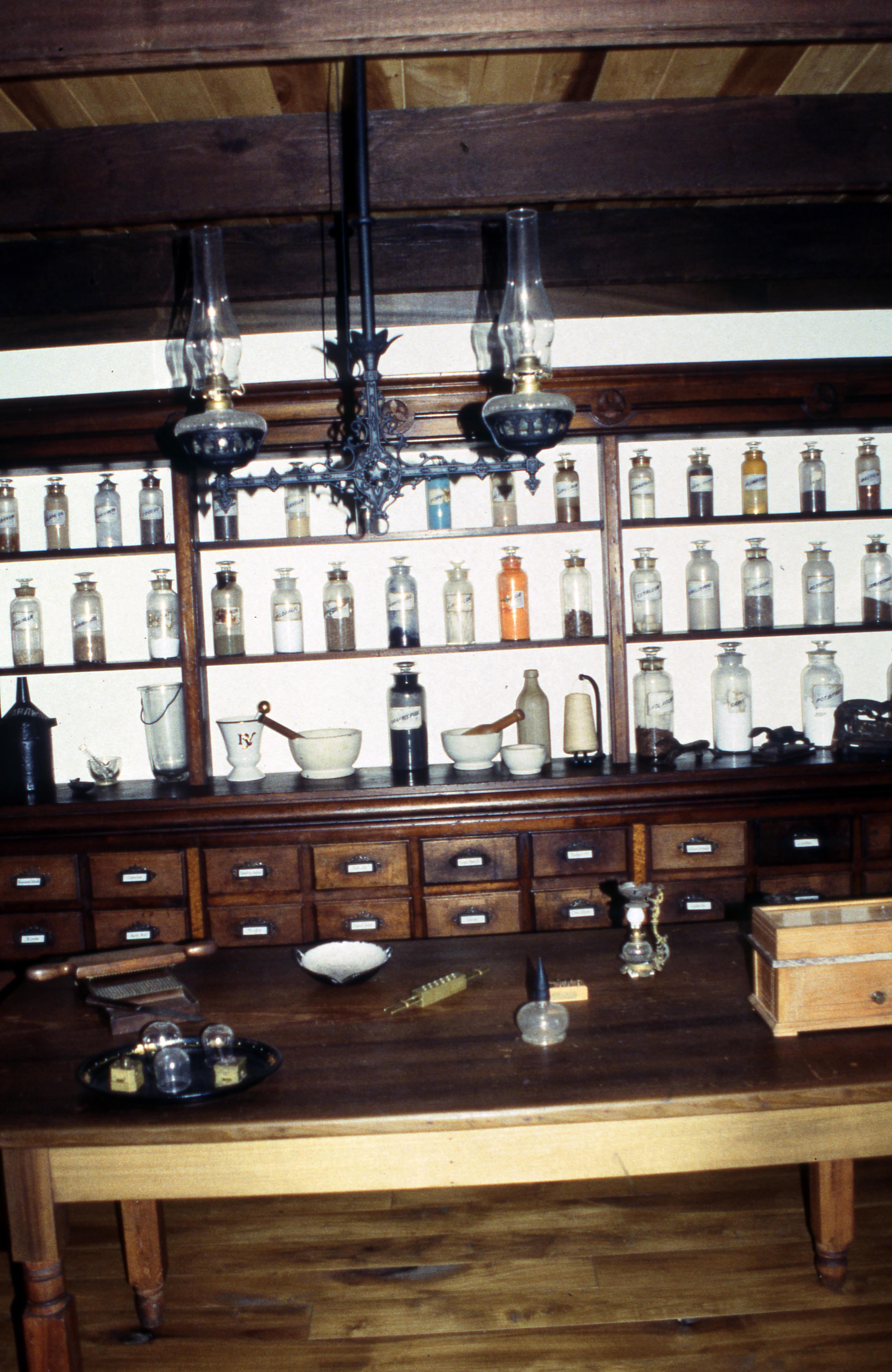 Kemmerling House/1850s Doctor's Office: The Kemmerling House was relocated from town Block 4 J/SE to the new location at 611 Church Street, beside the Beal House. The Kemmerling House was remodeled into the 1850s Doctor's Office, a gift to the town of New Harmony from Mead Johnson. The Kemmerlings were listed in the 1882 Posey County Directory (as Kimmerlin) as being New Harmony Township farmers. Elmer Buchta Moving Engineers was contracted for this and many other building moves during the 1970s. This photo shows the pharmacy counter in the 1850s Doctor's Office. Note the shelves full of nineteenth century pharmaceutical chemicals and the row of mortar and pestles on the bottom shelf.