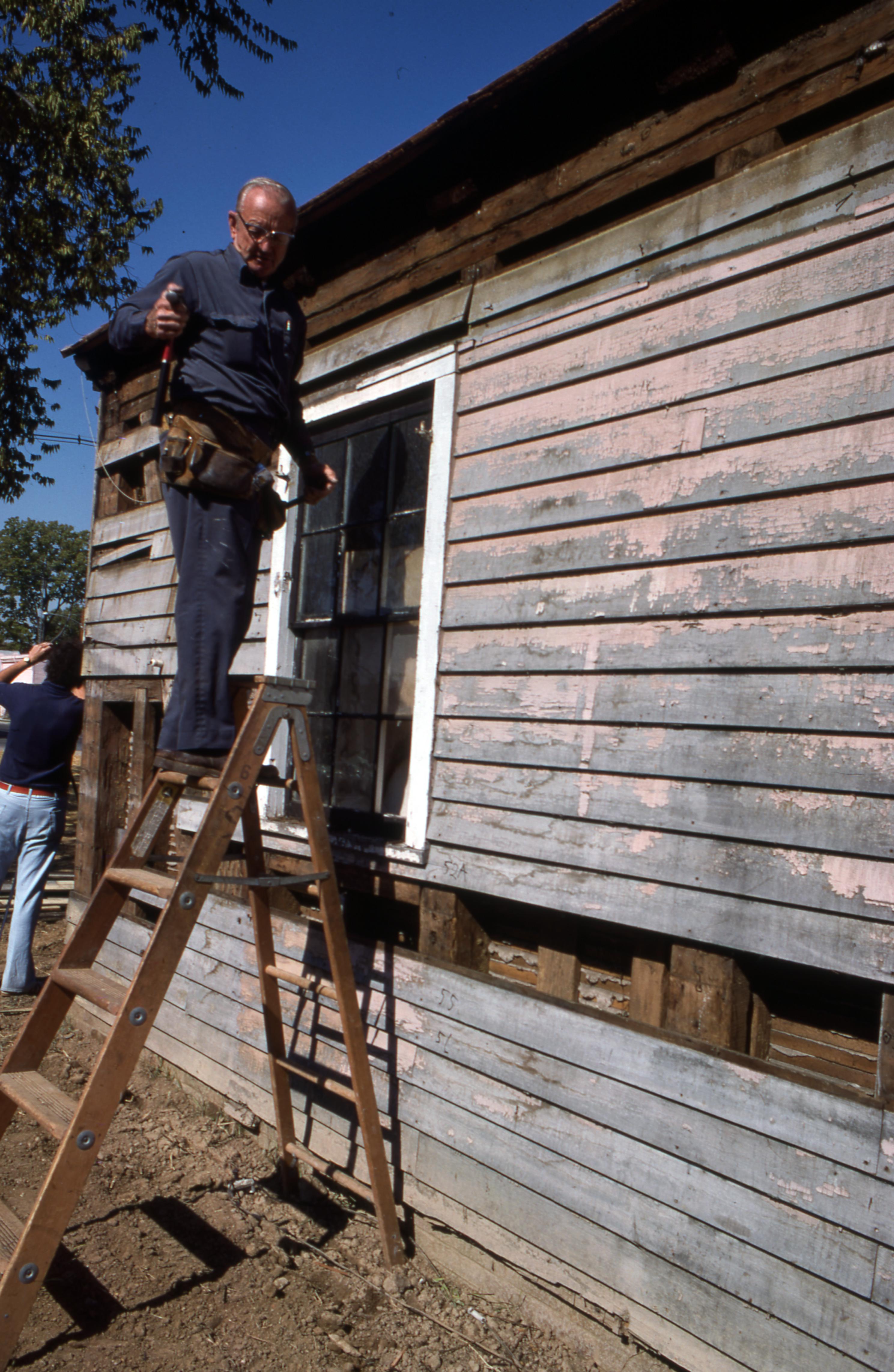 Beal House: The Beal House was moved during the Lanark Construction, on Town Block 8 E/W on Main Street to 611 Church Street. The Beal house was constructed around 1829 by John Beal, who was a carpenter in the Owen and Maclure community. Beal constructed the house from lumber and timbers from an older horse barn. The new location would be the site of the Beal House and 1850s Doctor's Office (The Doctor's Office was a remodel of the Kemmerling House, which was also moved to this site). Elmer Buchta Moving Engineers was contracted for this and many other building moves during the 1970s. In this photo a man is inspecting one of the six over six windows on the house.