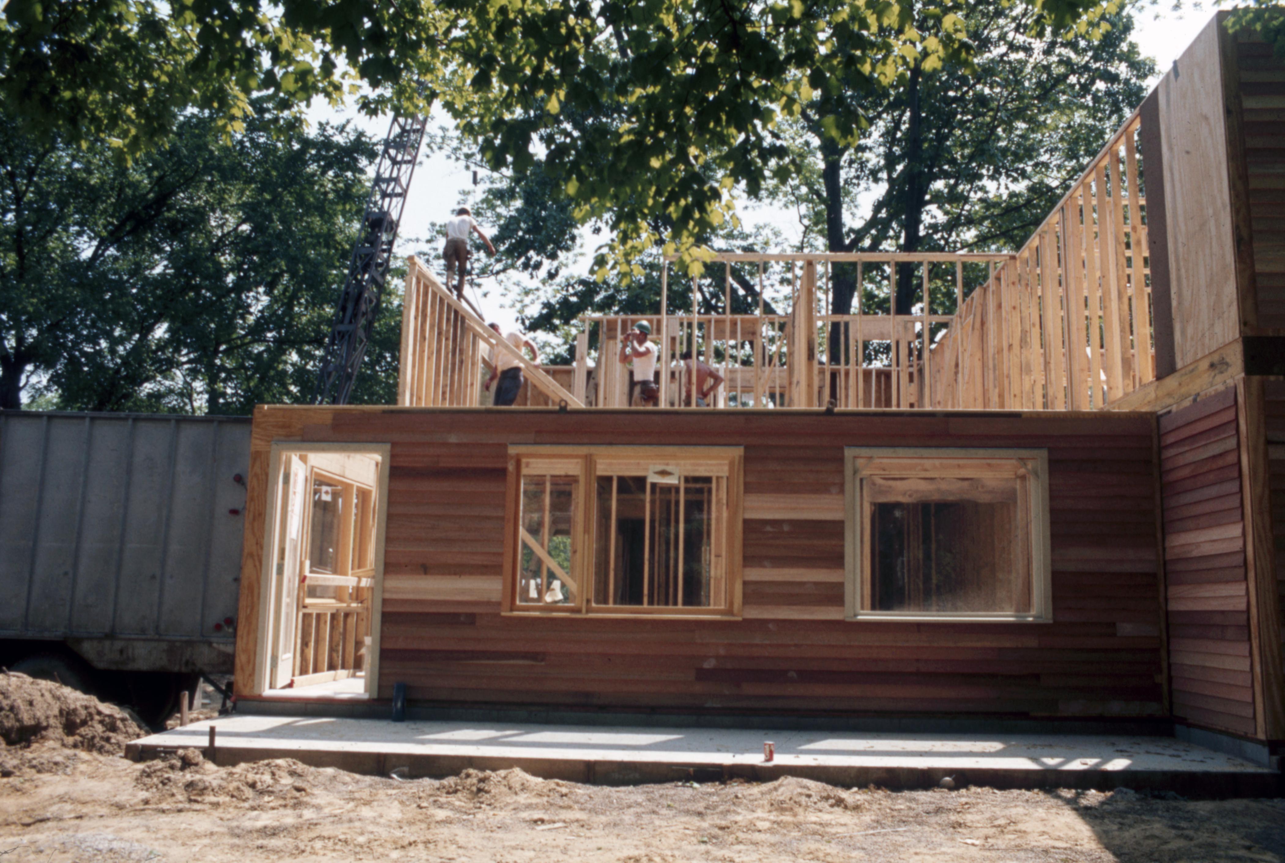 Lanark Development Collection: Construction of 820 Main Street New Harmony Indiana. Men working on the new construction. Construction of the second story. There is an orange Crush soda can sitting on the porch foundation.