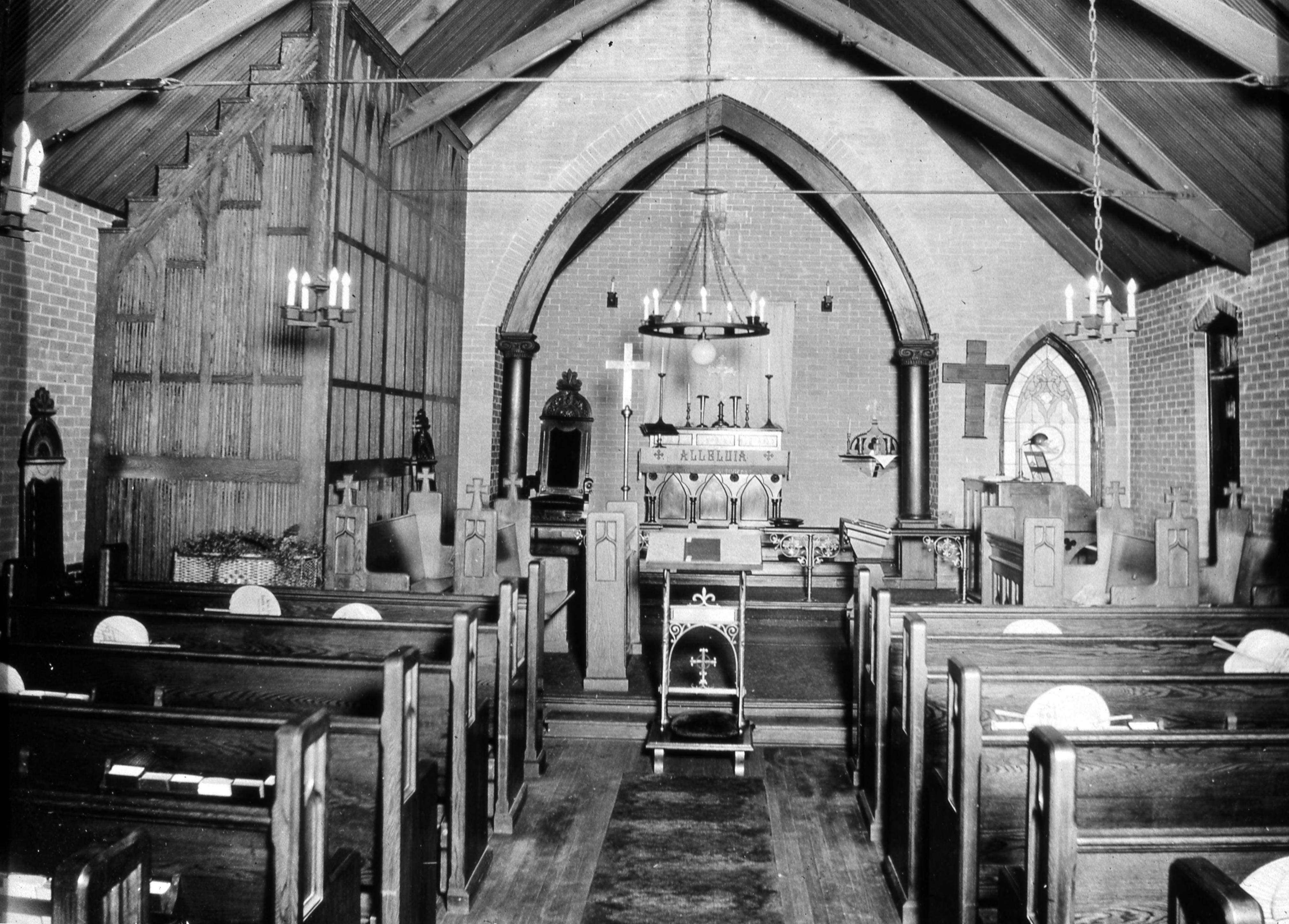 St. Stephen's Church: The church was first organized in 1841 and in 1843 the west wing of the old Rappite church was given for use by the Episcopal�s by Alexander and Anne Maclure. At this time the old burial ground was also given to the church, which was bought back by the Rappites in 1846. Then in 1850 the Episcopal�s sold the west wing of the old Rappite Church for $1000 and in 1854 St. Stephen�s Church was constructed, the North Street location where the Lenz House now resides.1888 saw the construction of a new belfry add to the church to accommodate the new bell. In 1911 the new church was built, and an addition was made to it in 1927. The church is still present as of 2022. This photo shows the inside of the church.