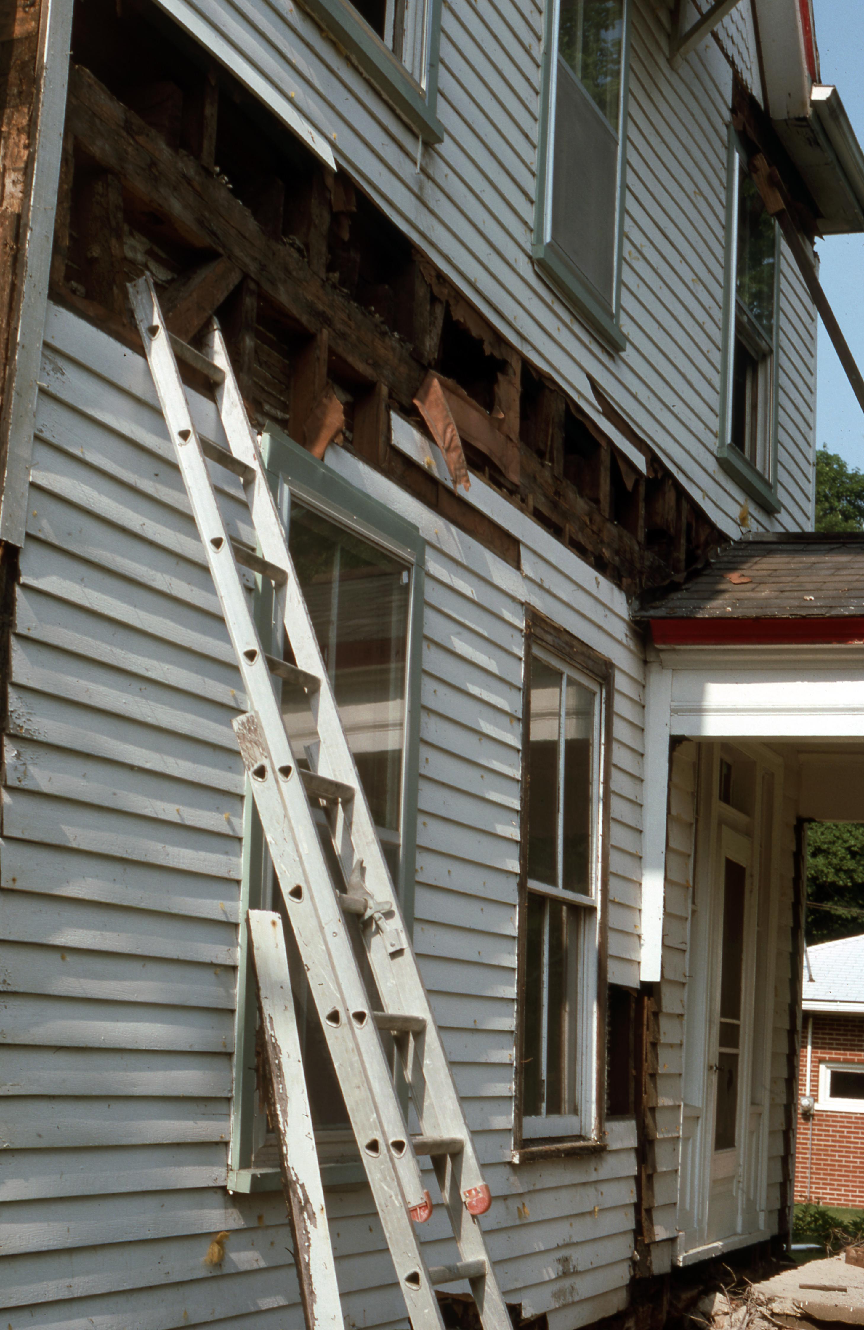 Golden House: This building was moved from the plat of 807 Church, what is now 811 Church Street, to one plat west of 723 E. Church Street but has since been demolished, most likely when the house at 707 E. Church was built in 2009. Elmer Buchta Moving Engineers was contracted for this and many other building moves during the 1970s. In this photo the original timber frame has been exposed from under the old clapboards.