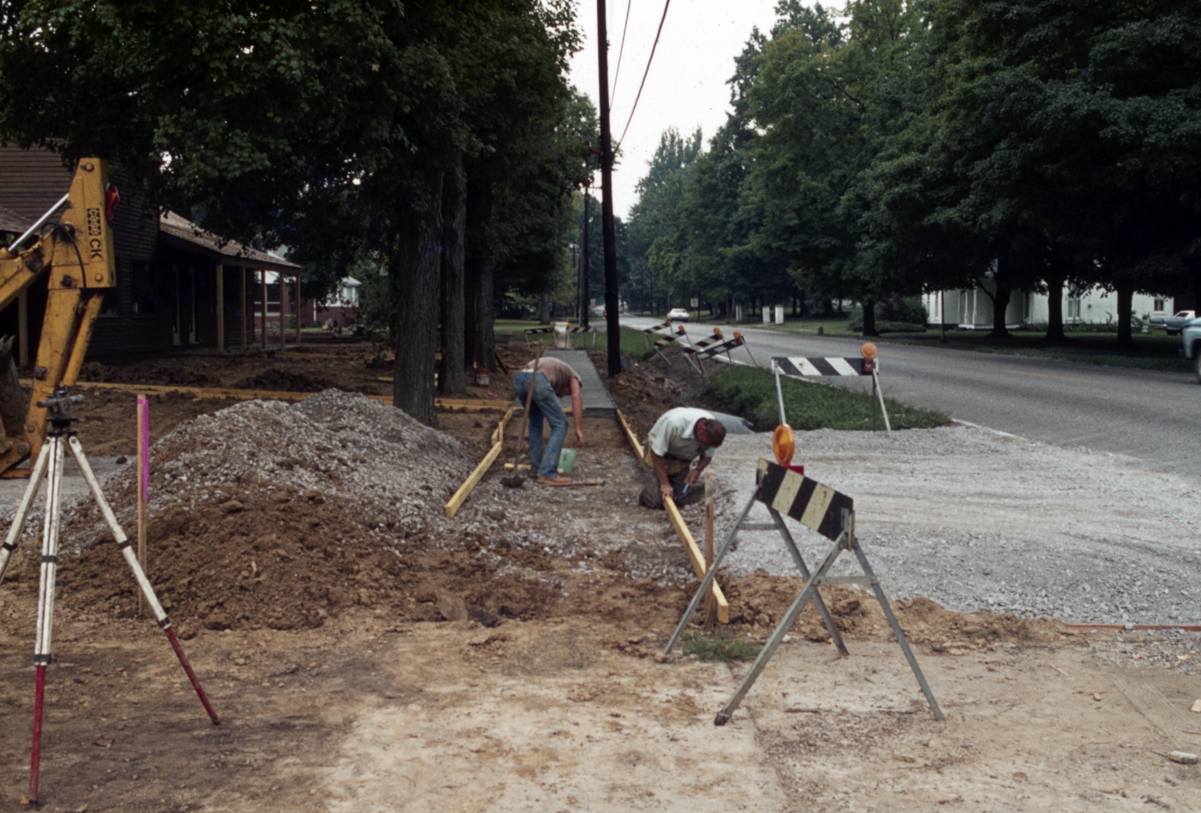 Lanark Development Collection: Construction of 820 Main Street New Harmony Indiana. Workmen constructing the sidewalk and driveway at the front of the building.