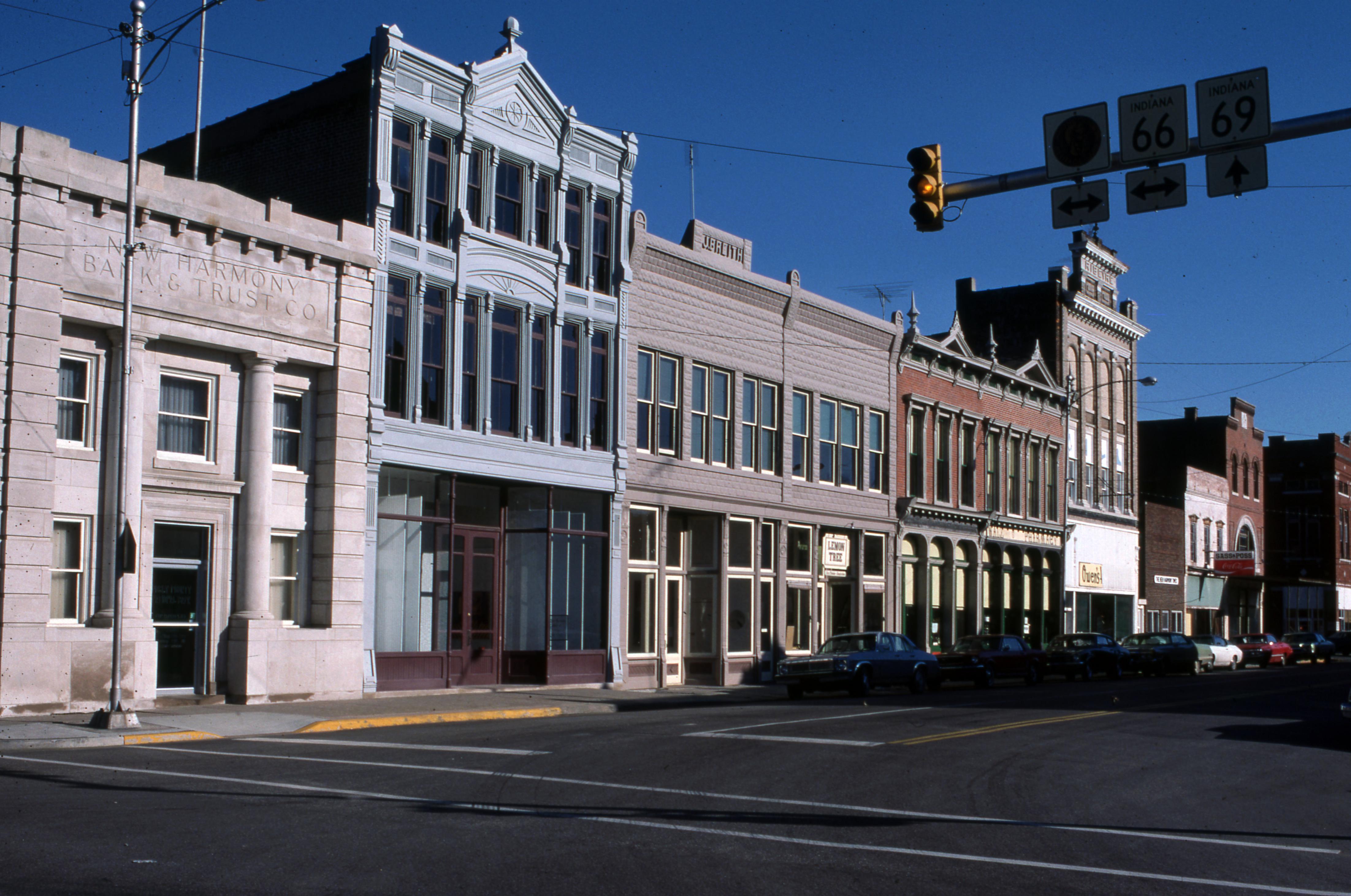 Streets: This is a photo of the businesses along the east side of Main Street, facing south, between Church and Tavern. From left to right: New Harmony Bank & Trust Company which had become the Posey County National Bank, the Privy Shop, the Kopper Kettle Gift Shop, The Main Cafe, Heart of Harmony antiques, Walz Pharmacy, Owen's Variety, The New Harmony Times newspaper, Sass and Poss's tavern, and an antique shop. Across Tavern Street is the old Independent Order of Odd Fellows building.