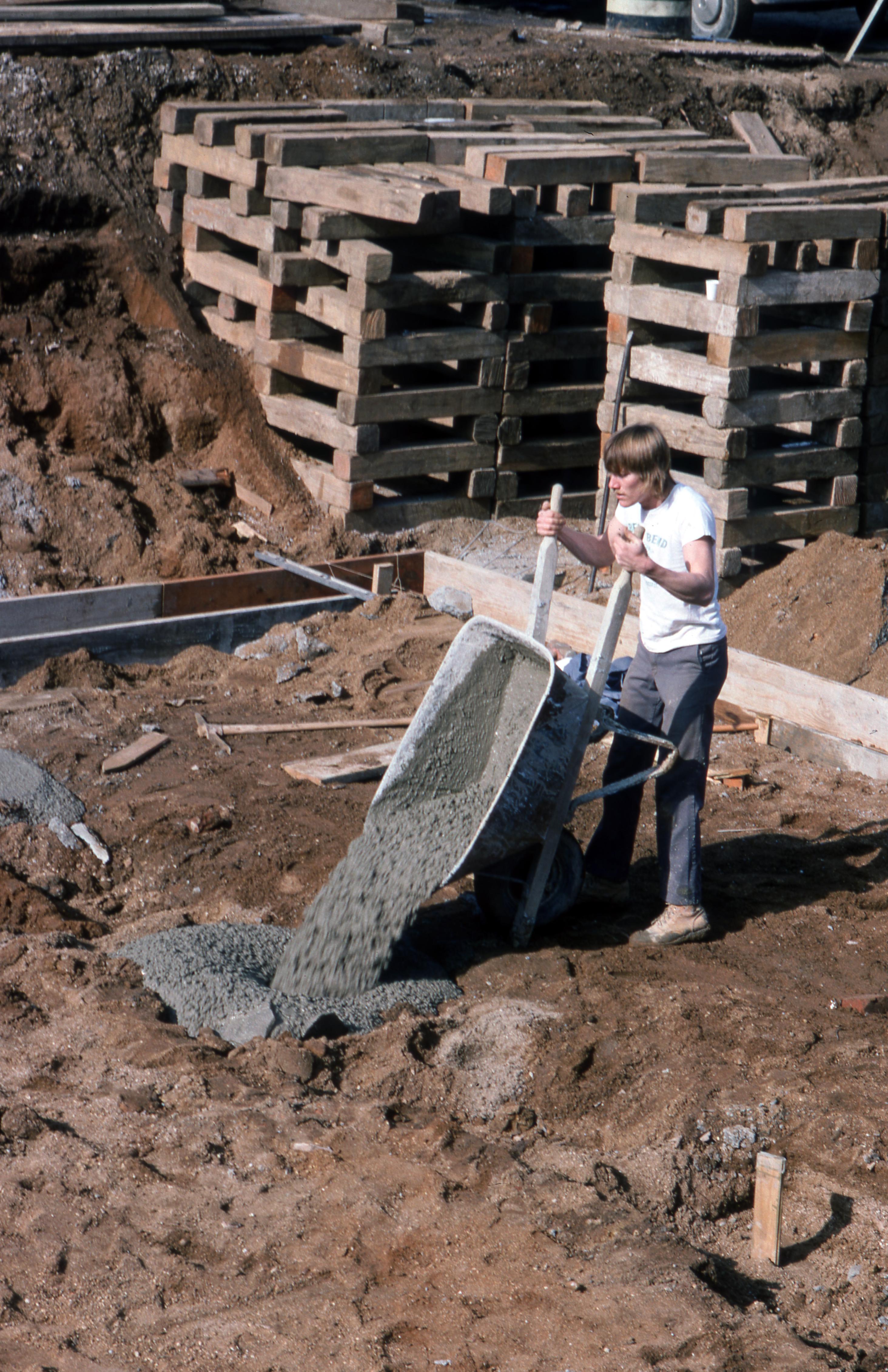 Beal House: The Beal House was moved during the Lanark Construction, on Town Block 8 E/W on Main Street to 611 Church Street. The Beal house was constructed around 1829 by John Beal, who was a carpenter in the Owen and Maclure community. Beal constructed the house from lumber and timbers from an older horse barn. The new location would be the site of the Beal House and 1850s Doctor's Office (The Doctor's Office was a remodel of the Kemmerling House, which was also moved to this site). Elmer Buchta Moving Engineers was contracted for this and many other building moves during the 1970s. This photo shows a construction worker pouring the footer for the new foundation walls.